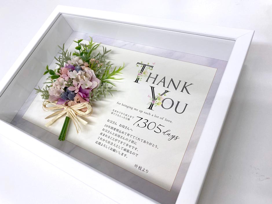 ありがとうの気持ちを花束にしたようなブーケアレンジと、生まれてから成人まで育ててもらった日数&メッセージが入る感謝ギフトです。