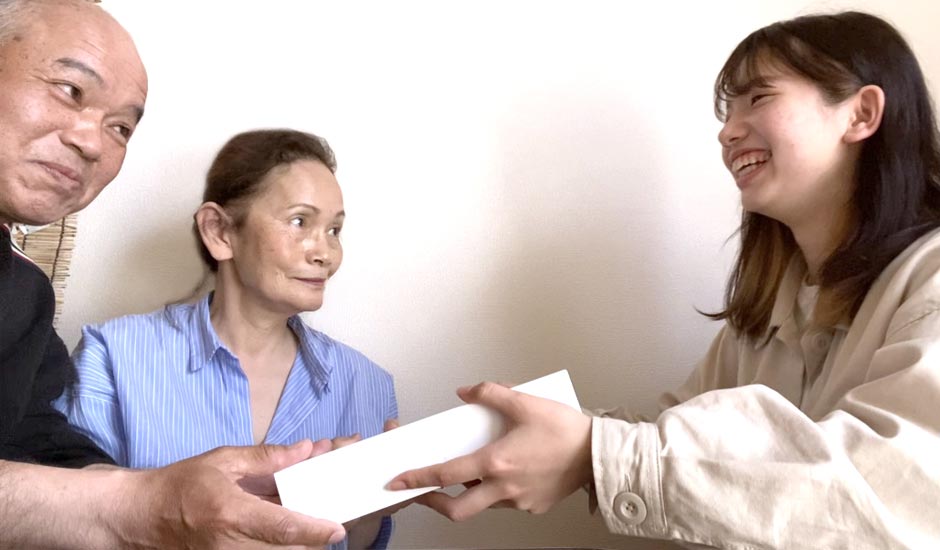 そしていよいよ成人式の日。ご両親へ自ら制作したプレゼントを渡します。