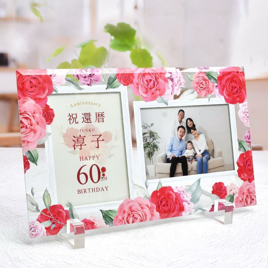 お孫さんからおばあさまへの還暦祝いなら、おしゃれな赤い花をデザインした名入れフォトフレームがおすすめ。お渡し後はお写真を2枚飾れるフォトフレームに。「これからたくさん楽しい思い出を作ろうね!」そんな想いをこめて贈ることができますよ。