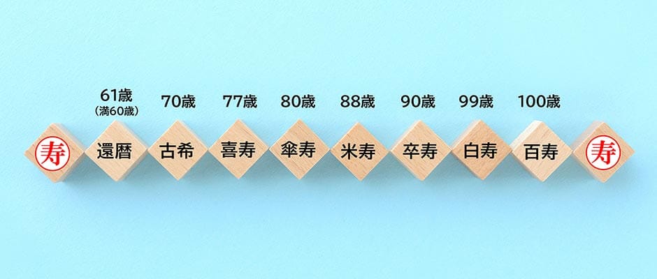 そもそも還暦祝いとは、60歳という人生の節目を祝う長寿祝いのひとつ。ちなみに長寿祝いは還暦にはじまり、古希、喜寿…と続きそれぞれに「お祝いの色」があります。