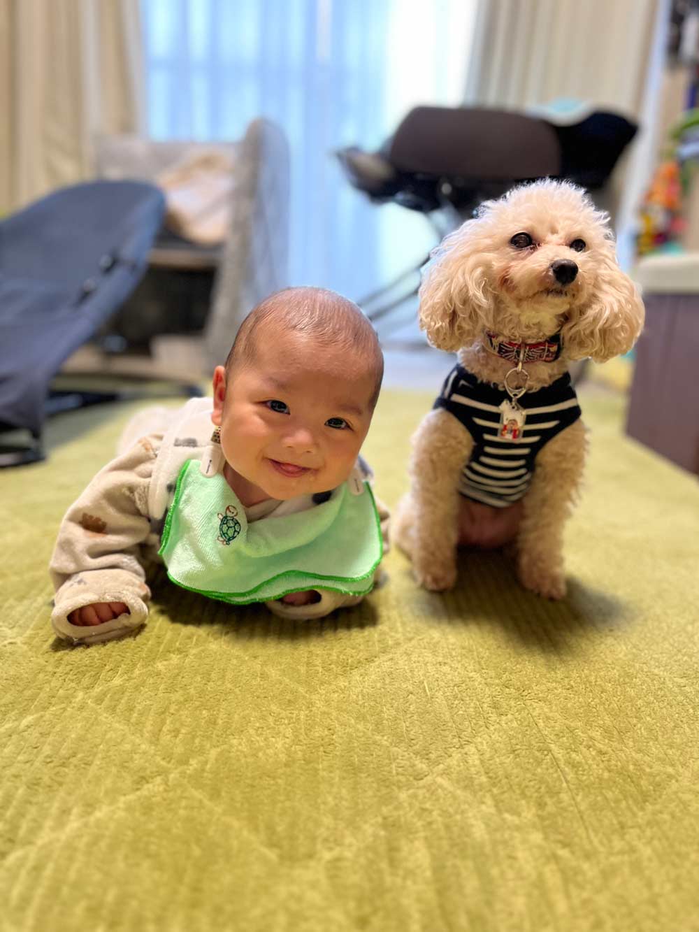隣でビシッとお座りするワンちゃんは新しく家族になったベビちゃんの良いお手本ですね😊