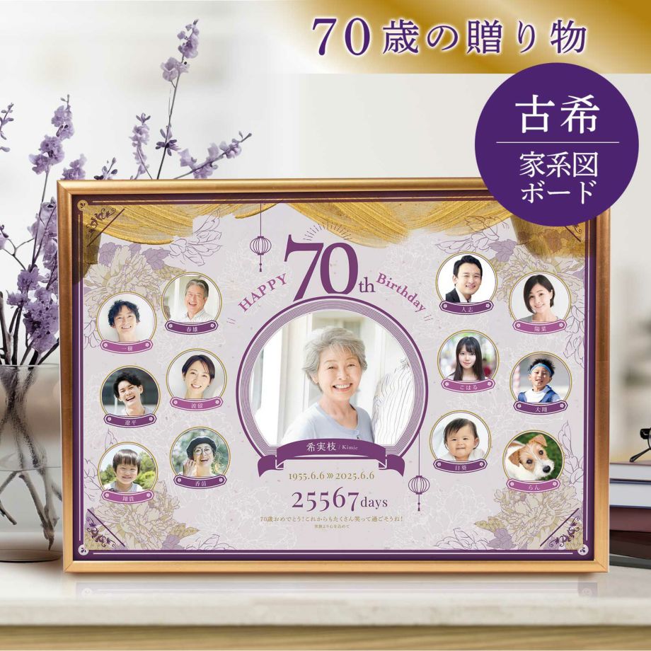 ご両親への古希祝いなら、家族の写真入りで作る家系図ボードがおすすめ。感謝も家族の愛も一目で伝わって感動まちがいなし!