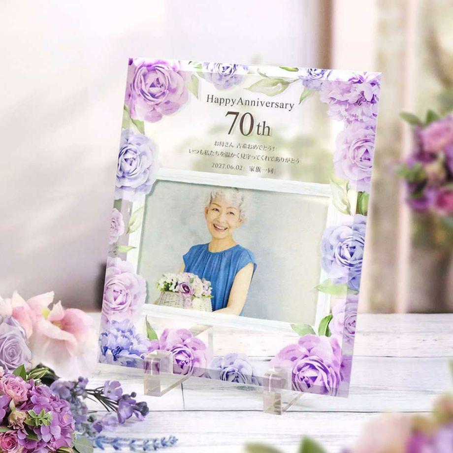 好きな写真を2枚セットして贈れるメッセージ&名入れ付きのフォトフレーム。古希のお祝いにふさわしい華やかな紫のお花を使ったオシャレなフォトフレームです。