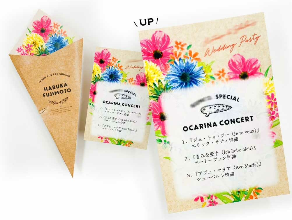 同じカラフルなお花のデザインでオカリナのイラスト入り。ハガキサイズのコンサートプログラムになりました!