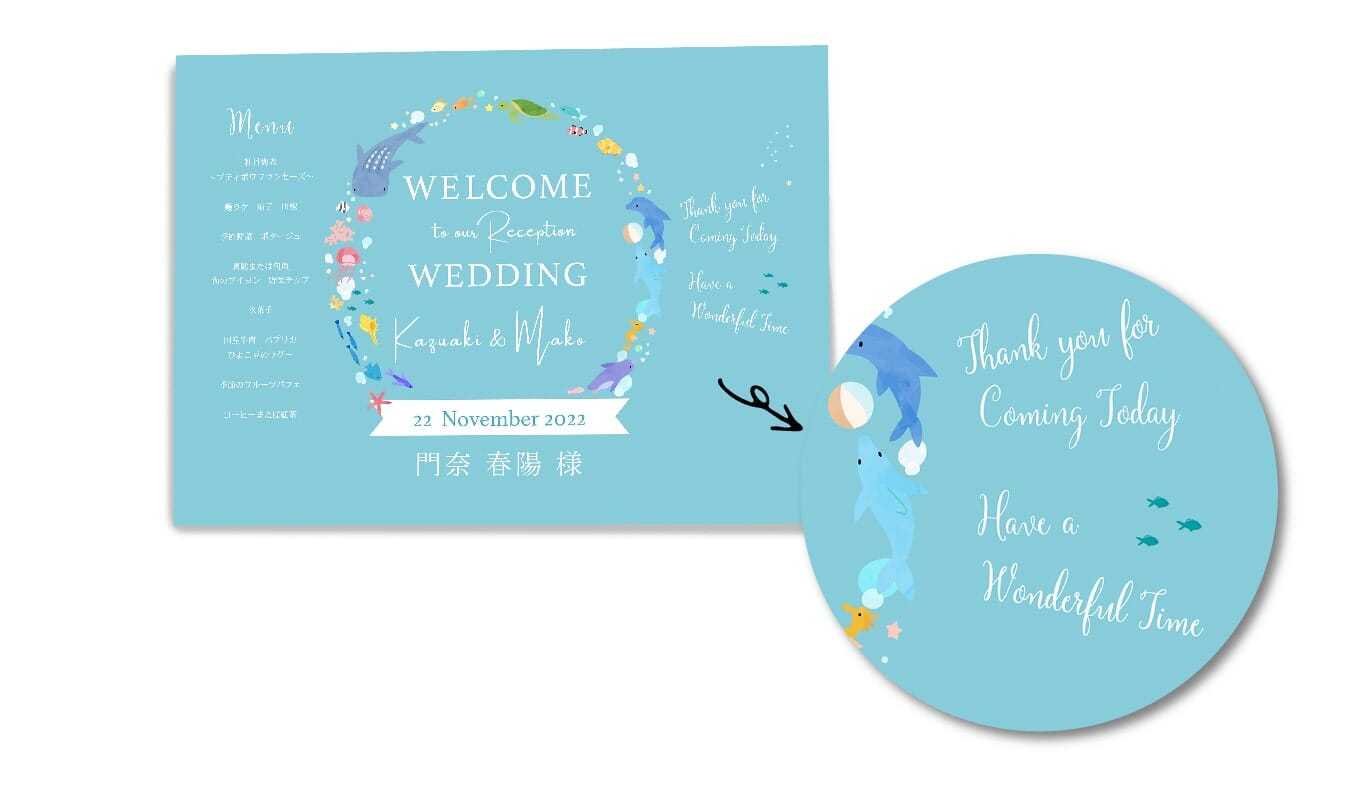 テーブルコーデの主役級。ランチョンマット席札を「水族館」風にアレンジしました!リゾ婚にもピッタリです。