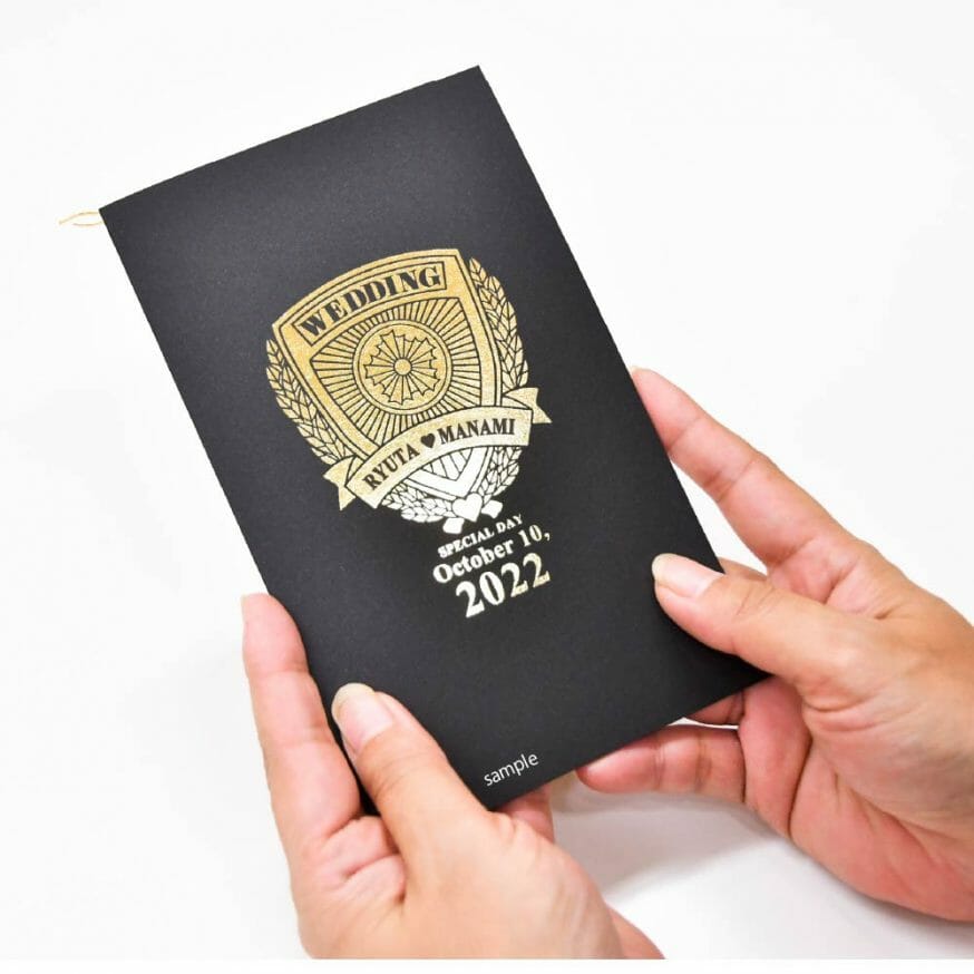 金箔加工で抜群の存在感!おなじみのエンブレムデザインが目を引きますよね。おふたりのお名前と挙式日入りです。