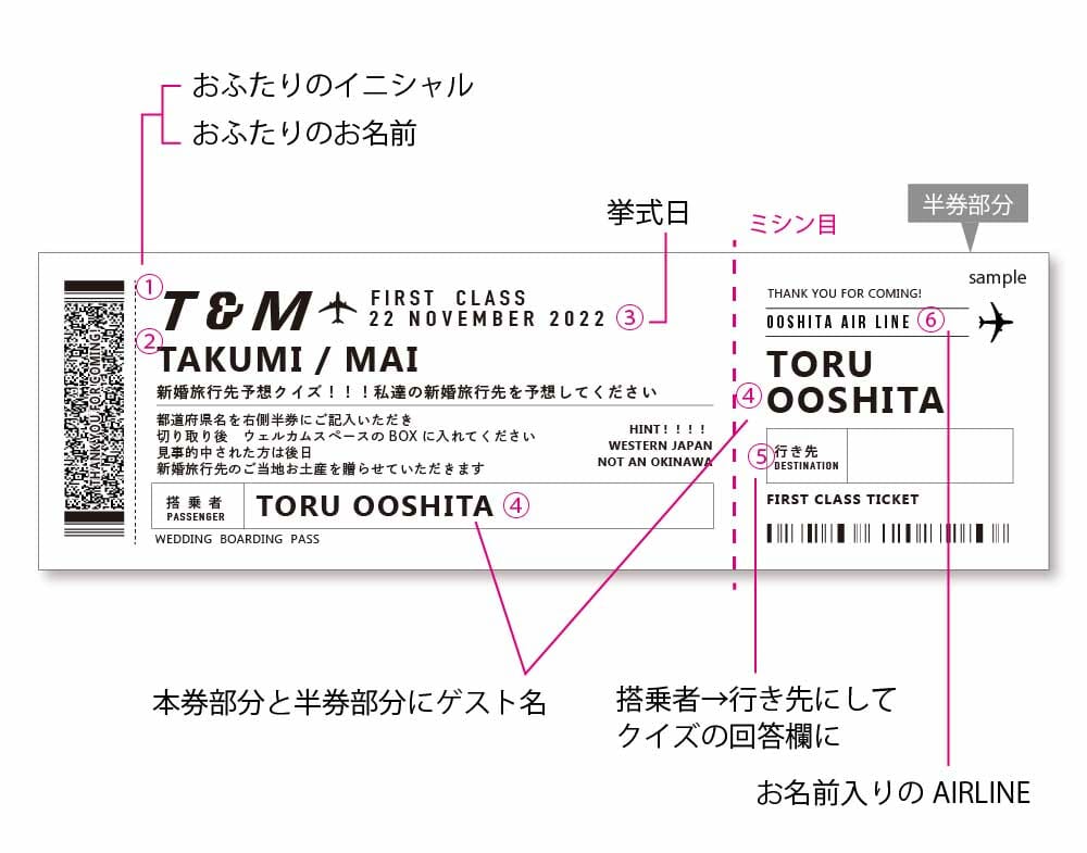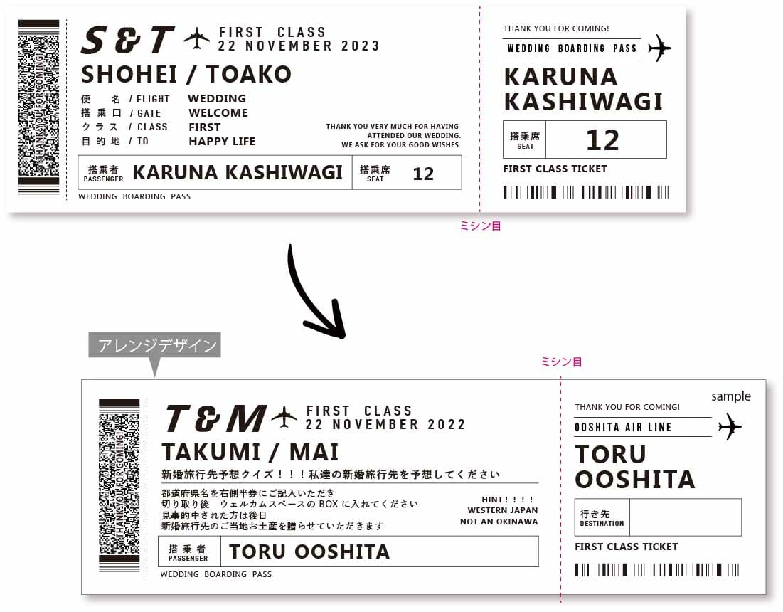 大人気エスコートカードをクイズ付き&回答記入欄付きのワクワク演出に!「新婚旅行先クイズ」と「航空券風デザイン」が見事にマッチしたアレンジです!
