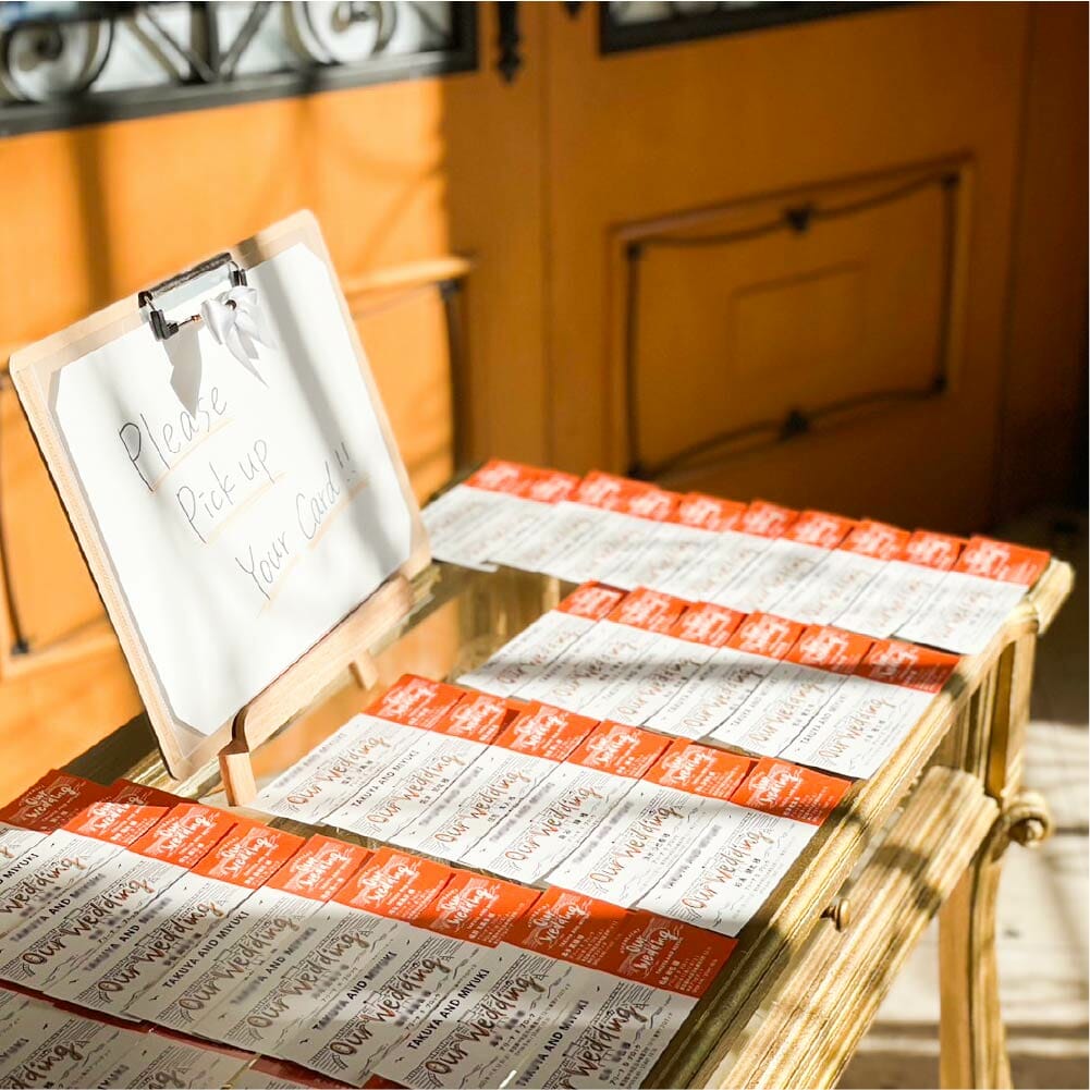 こんな風に受付スペースで並べたり飾ったりしてゲストにご自分のお名前を探して受け取ってもらいます。