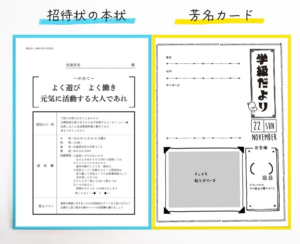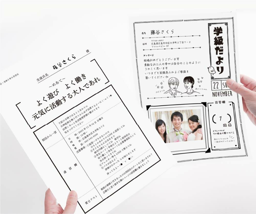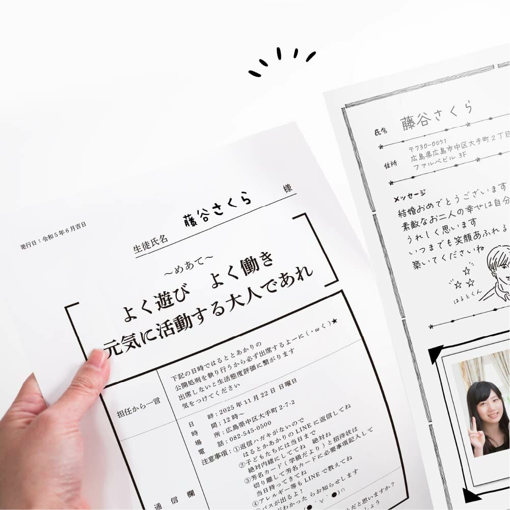 小学校でおなじみ「通知表」と「学級だより」をモチーフにした招待状