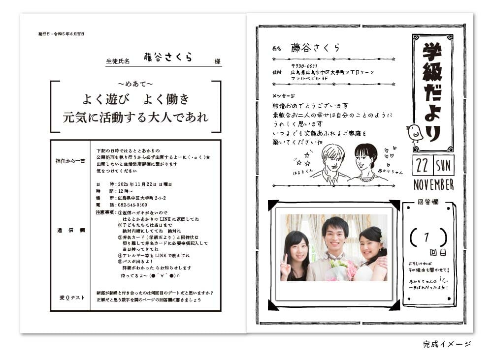 当日受付で書いてもらったり、予め招待状に入れておいて、当日までにゲストに書きこんでもらうタイプなどありますが、今回はまさに招待状とセット。さらに学級だより風にアレンジするとこうなりました!