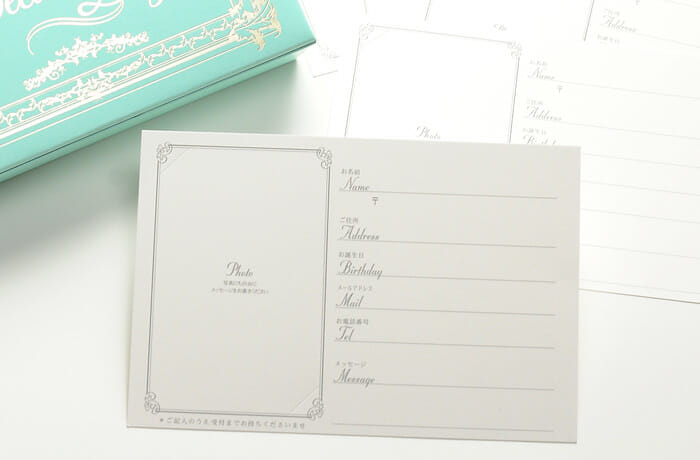 そして、右側の芳名カード。一般的にゲストカードとも言いますが、こちらはゲストの名前や住所を結婚式書き込んでもらうカードの事。