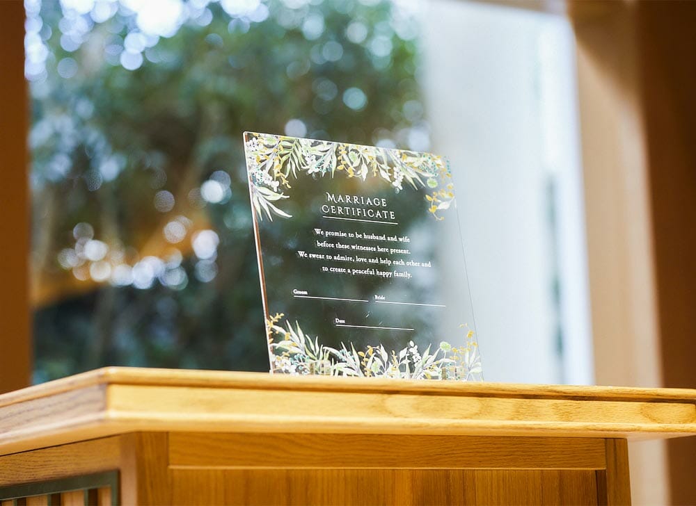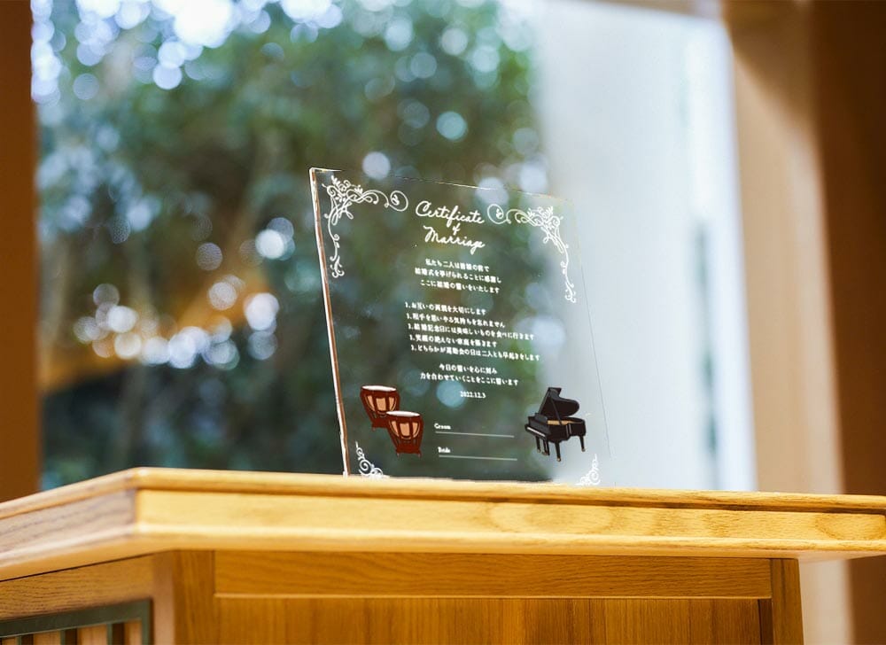 音楽家のお二人がつくられたオリジナルの結婚証明書。シンプルだけどどこにもない!そして、なんといっても、アクリルのあるある。文字が見えにくい問題をなるほどアイデアで解決したI様の結婚証明書をご紹介します。