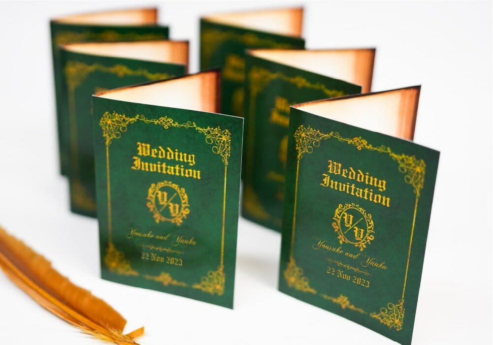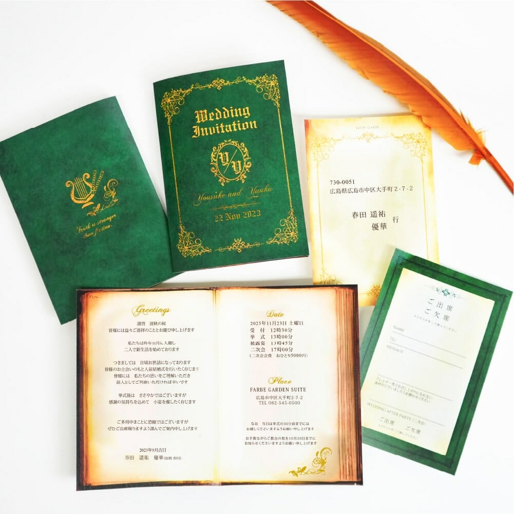 ファンタジー好きにはたまらない!アンティークな洋書をモチーフにした世界観あふれる招待状。二つ折りにして開くと本のような仕上がりに!アンティーク好きな方にもぜひ参考にして欲しいアイテムです