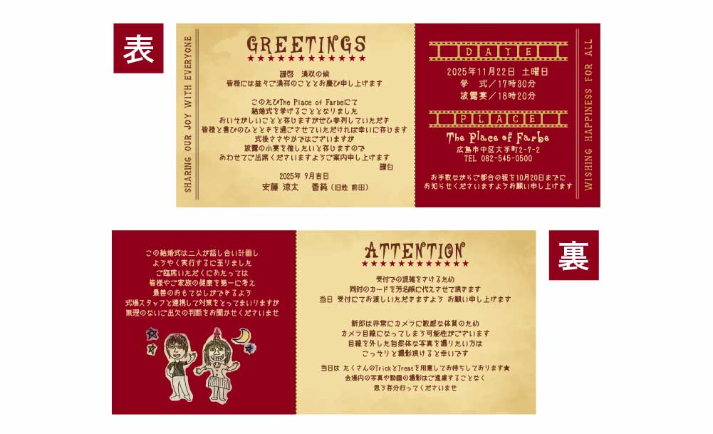 2枚目の裏は、おふたりの似顔絵イラスト入りの挙式アナウンス。何だかとってもおもしろい…!おふたりらしさ全開の内容になってます。