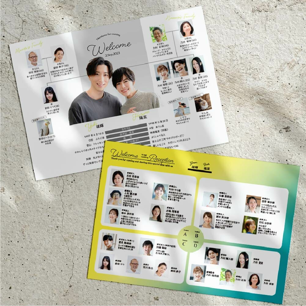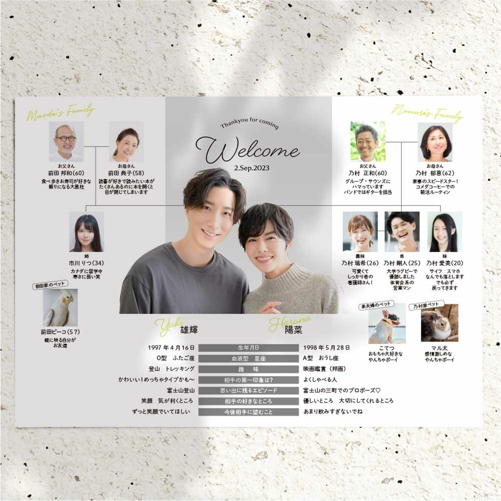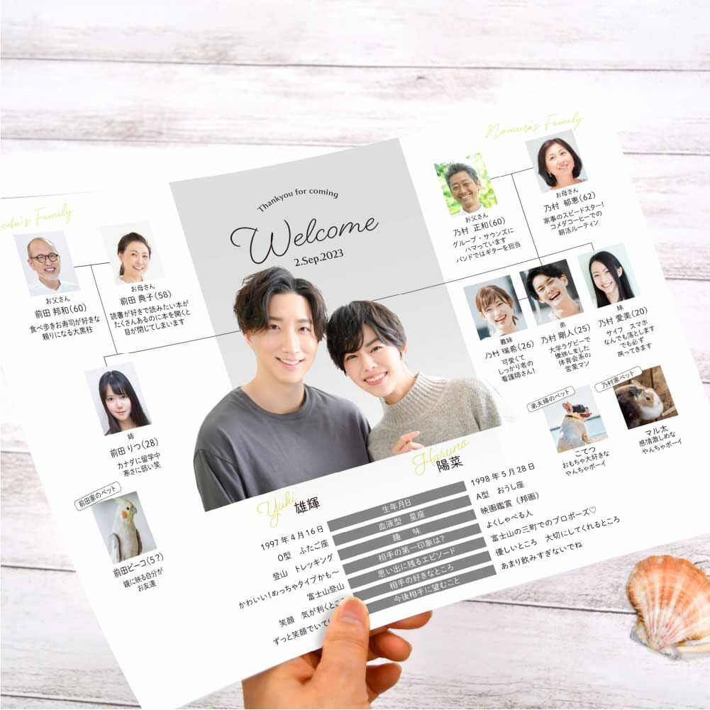 両家ご家族の紹介とお二人のプロフィールがひとつにまとまったものって、実はなかなか無いんですが、家系図ならではのうれしい演出ですよね。