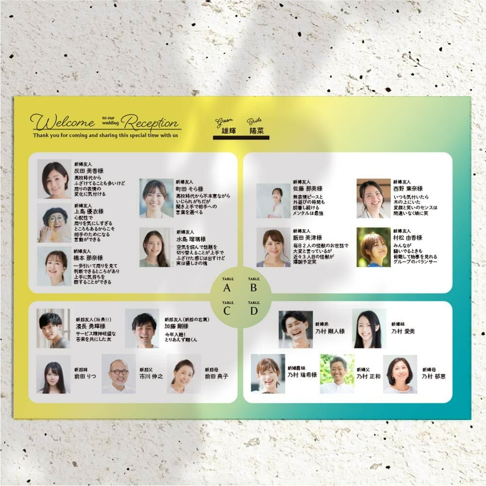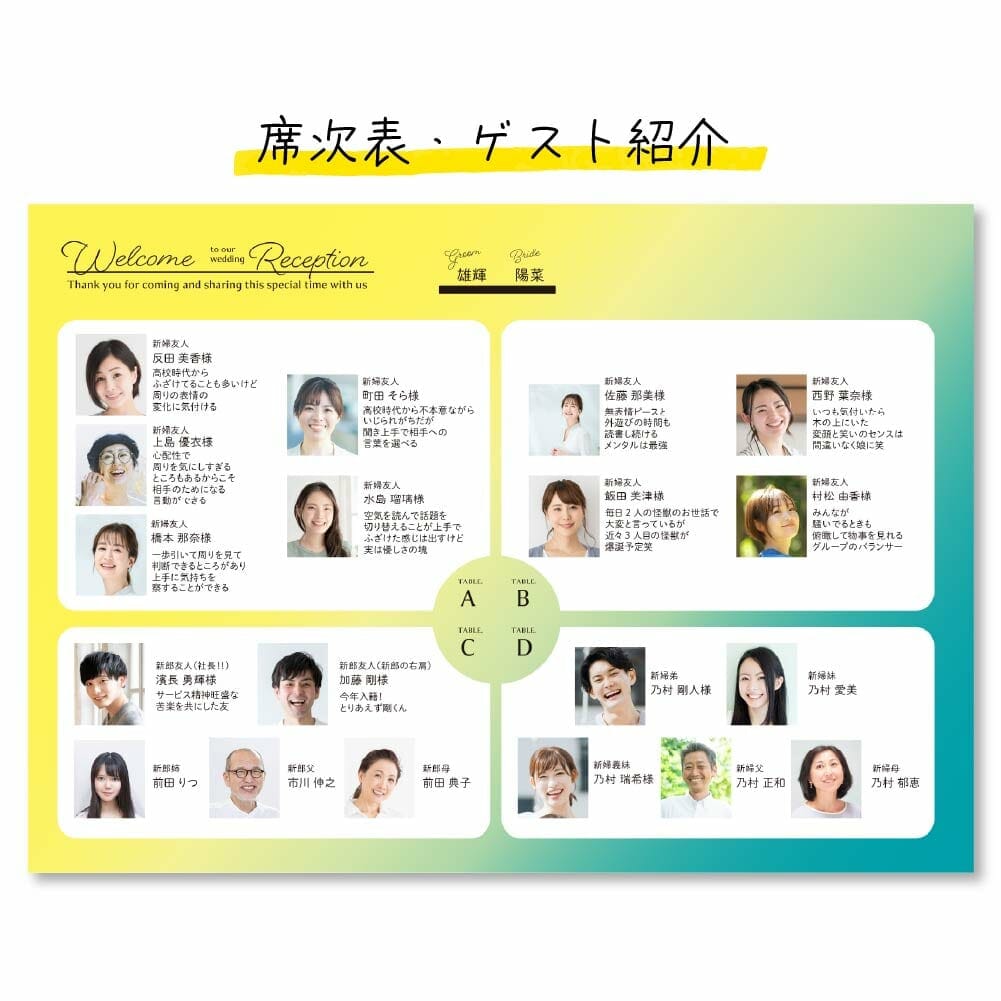 テーブル毎の席次(シーティングチャート風)とお写真入りでゲストのご紹介をさせていただきました。