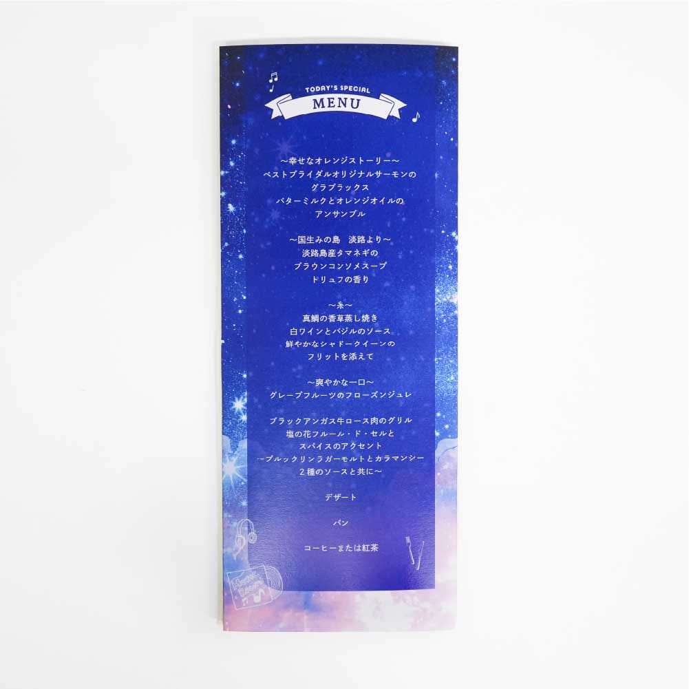 裏表紙にはメニュー表をお入れして完成♪3つ折りだけど充実の内容です