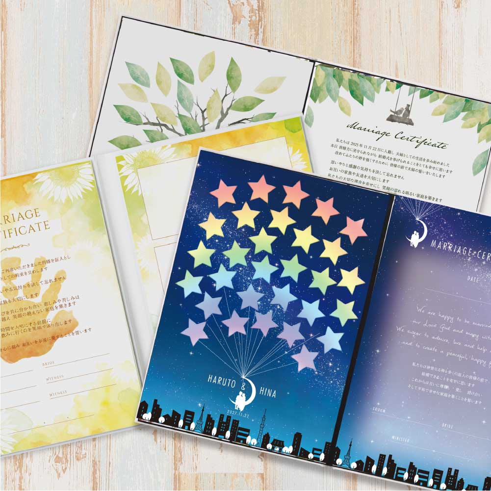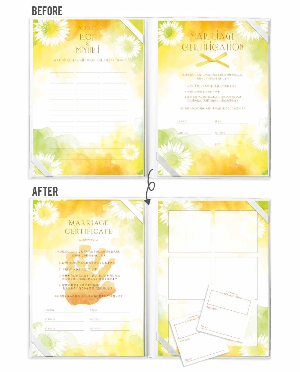 ゲストからの結婚の誓いを一緒に考え作り上げるリクエストカード付きの結婚証明書と夏婚にぴったりのひまわりデザインの結婚証明書とお子様の手形入り結婚証明書をミックス