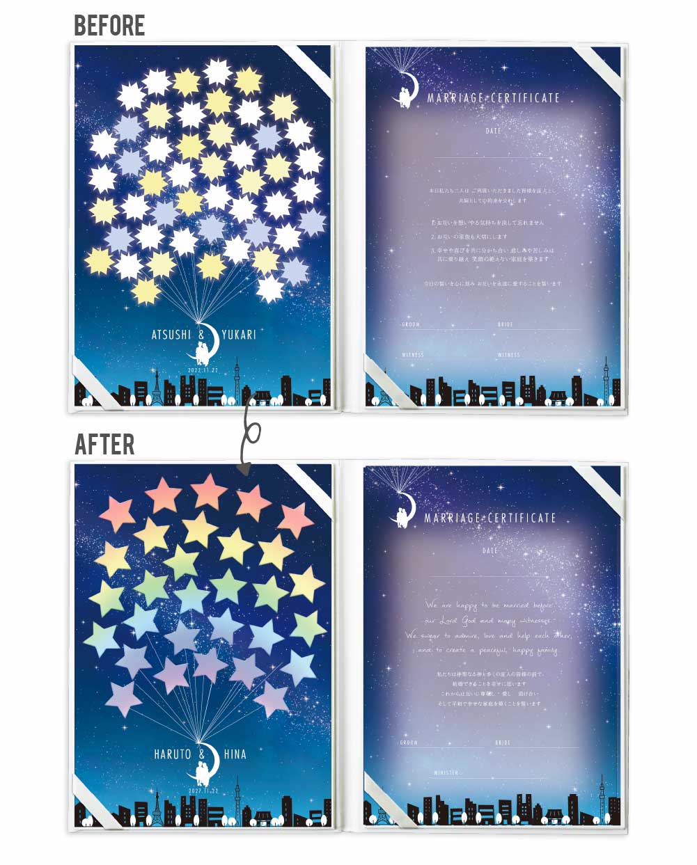 もともとある星空デザインの結婚証明書の星がレインボーカラーに!ちゃんと虹の弧をを描くようにデザインしてるんですよ!