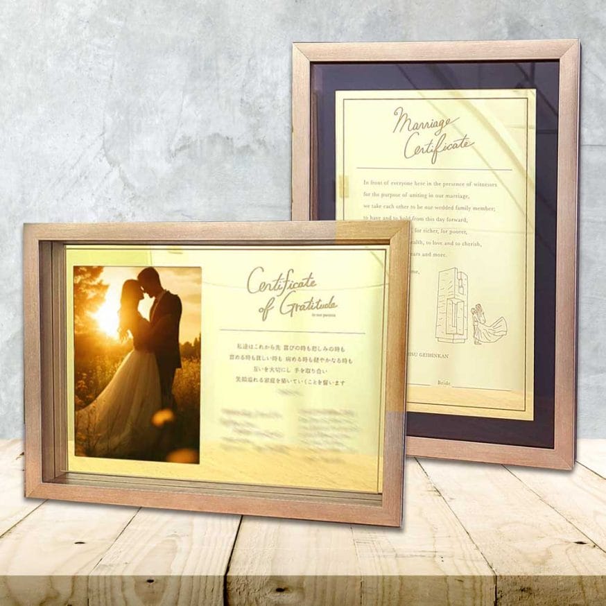 結婚証明書は細かい決まりが無いので、招待状や席次表といったアイテムと比べ、バツグンにアレンジしやすいのがポイントです