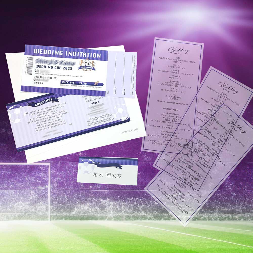 「パープル・サンフレッチェカラー」で統一した招待状・メニュー・席札 -