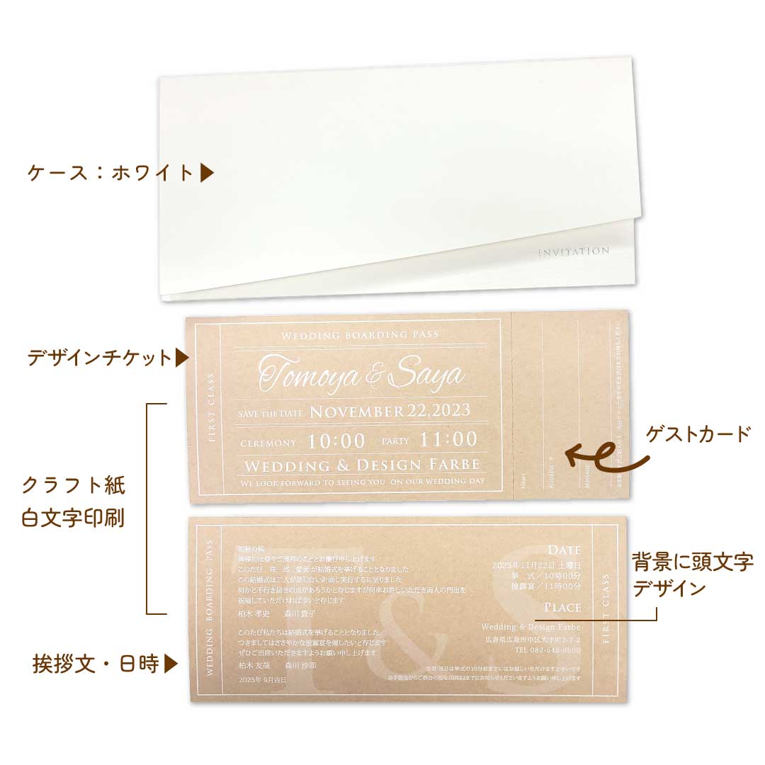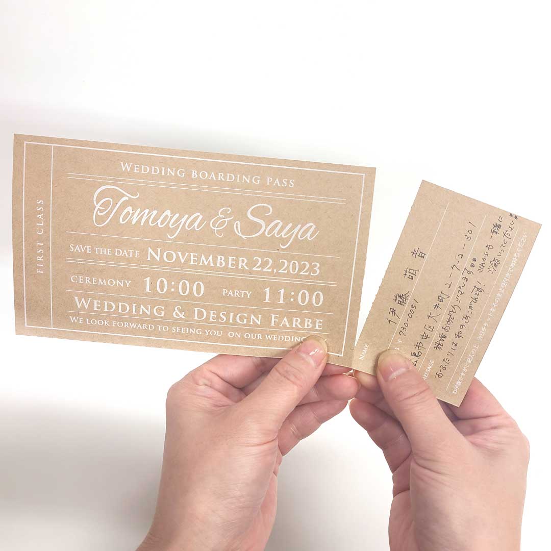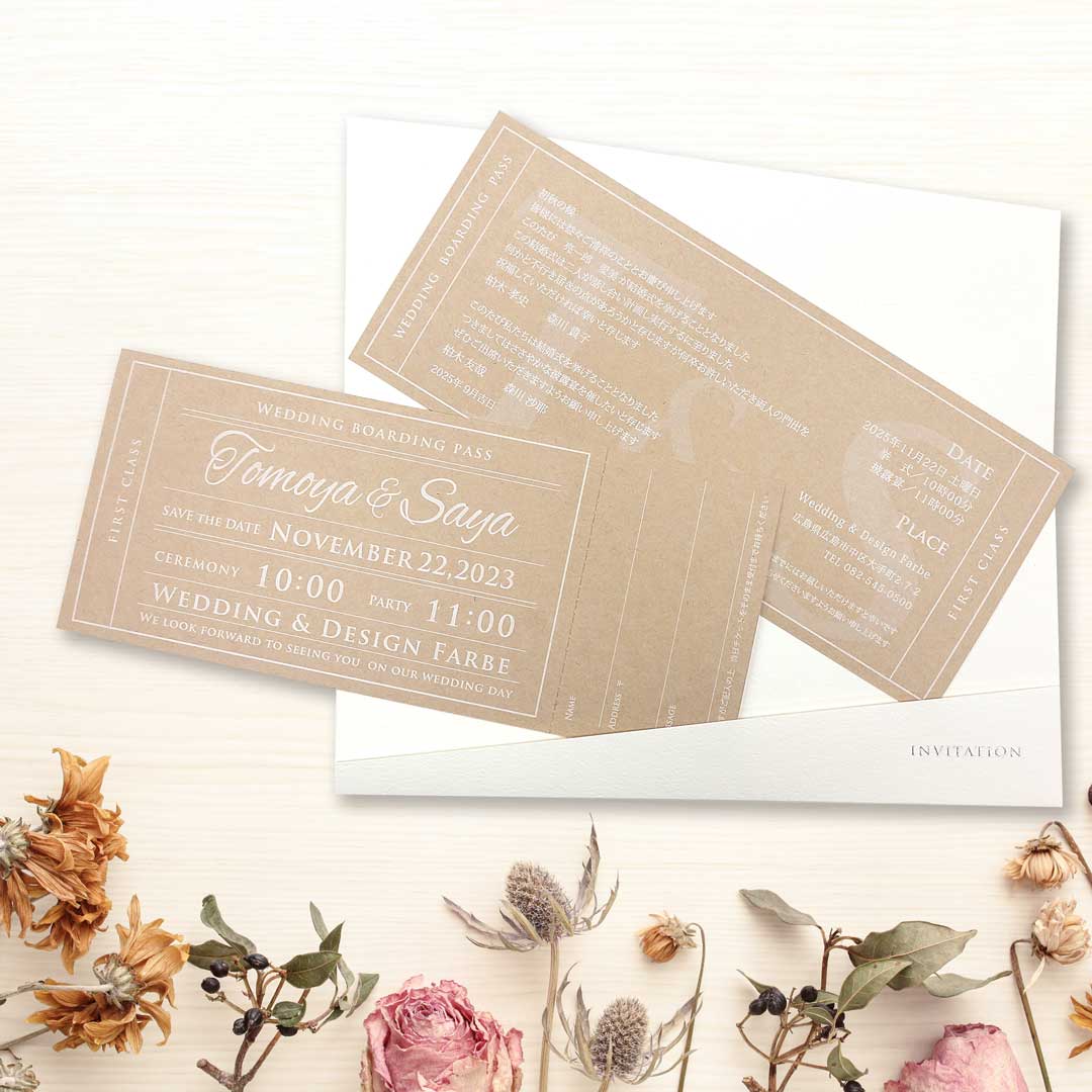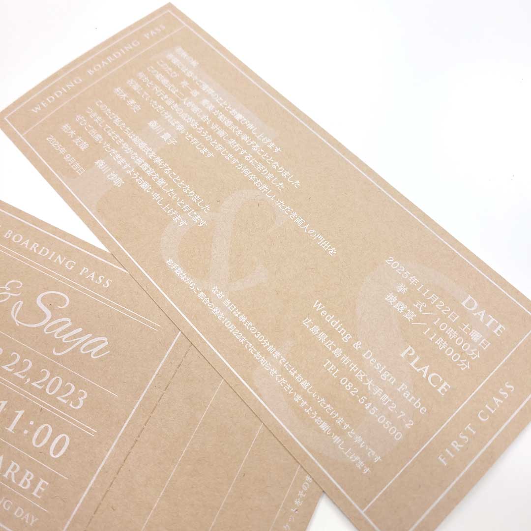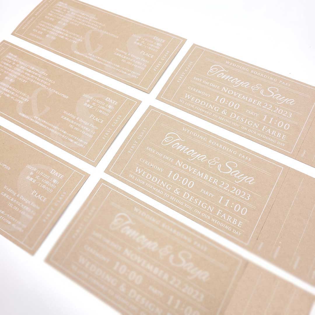 本日ご紹介するのはクラフト紙×白印刷にアレンジした クラフトチケット招待状です。