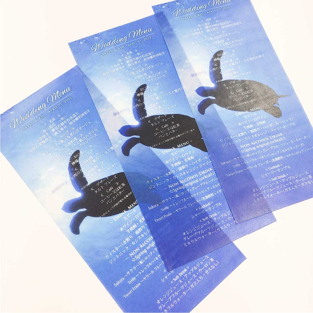 トレーシングペーパーを使用しているので、このように透け感のある涼しいメニュー表に仕上がっております。