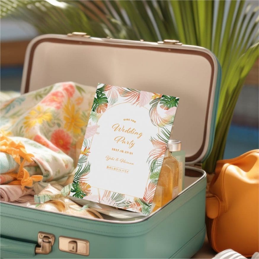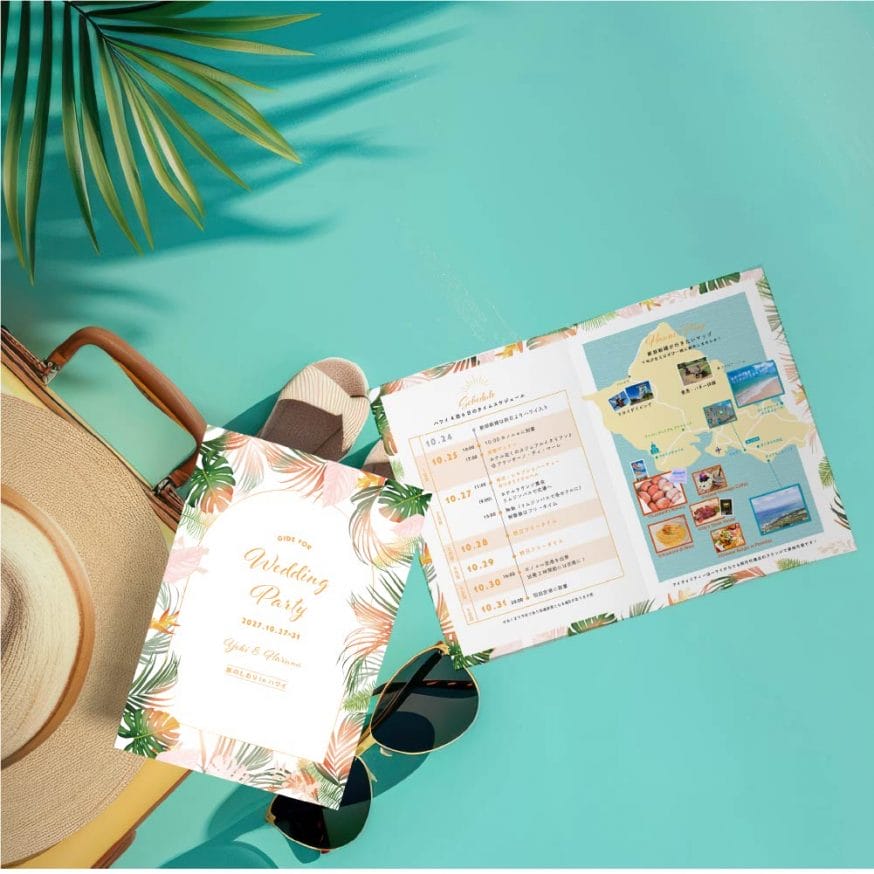 なので、準備しておくのは挙式当日ではなく、出発前。事前にゲストの皆さまに手渡してハンドブックとして持ち歩いてもらうアイテムになります。