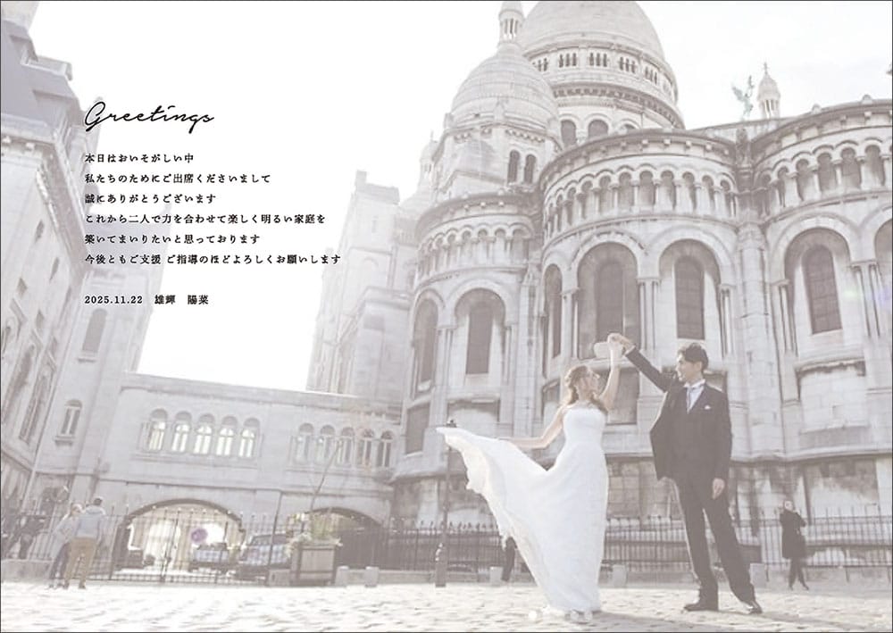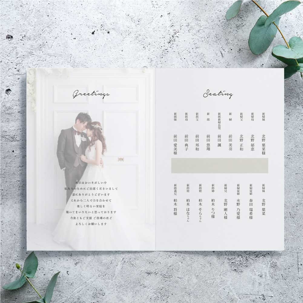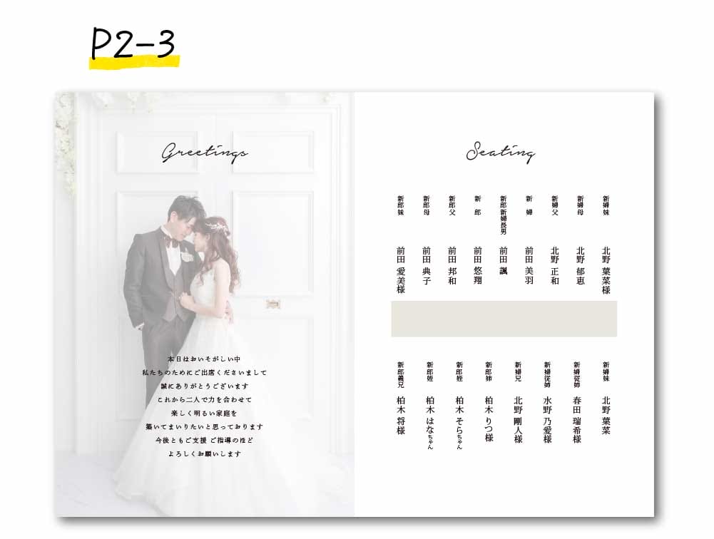 本来はこちら(上図)の見開きでお写真を全面にしたご挨拶ページとなりますが、挨拶部分をコンパクトにしてご家族の席次表もお入れしたレイアウトに。