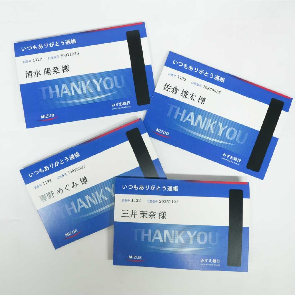 ④銀行名…み〇ほ銀行にちなんで みずお銀行 みずえ銀行 の2種類をご用意。