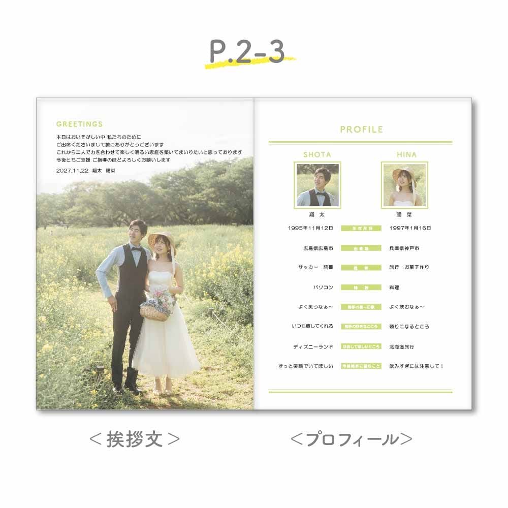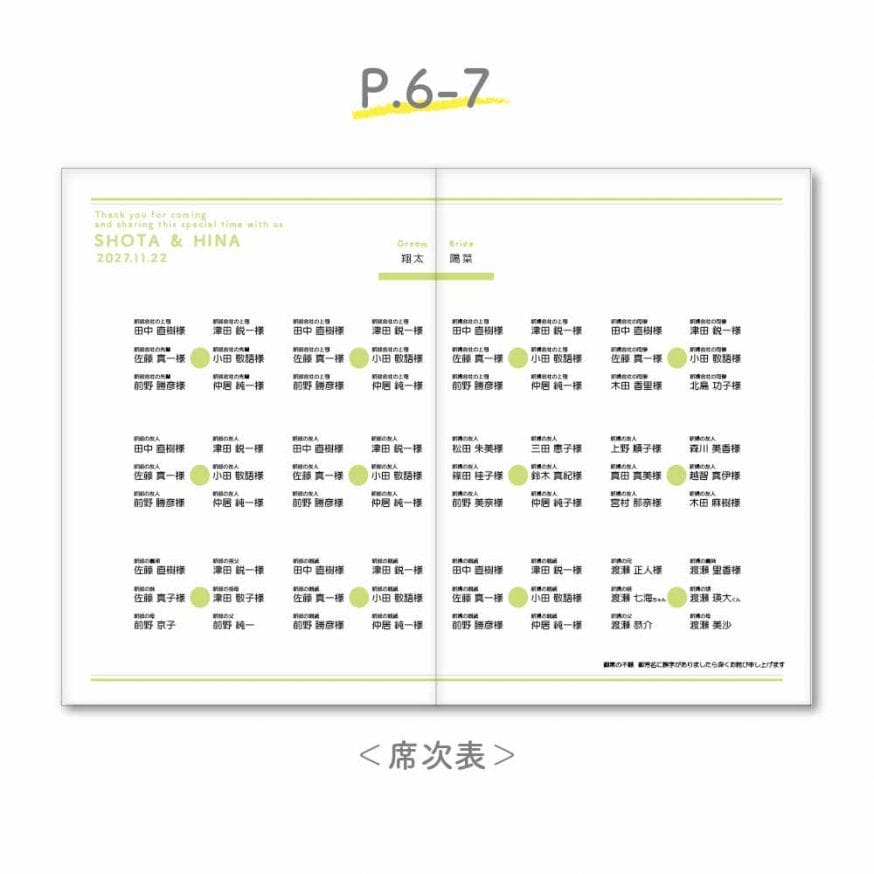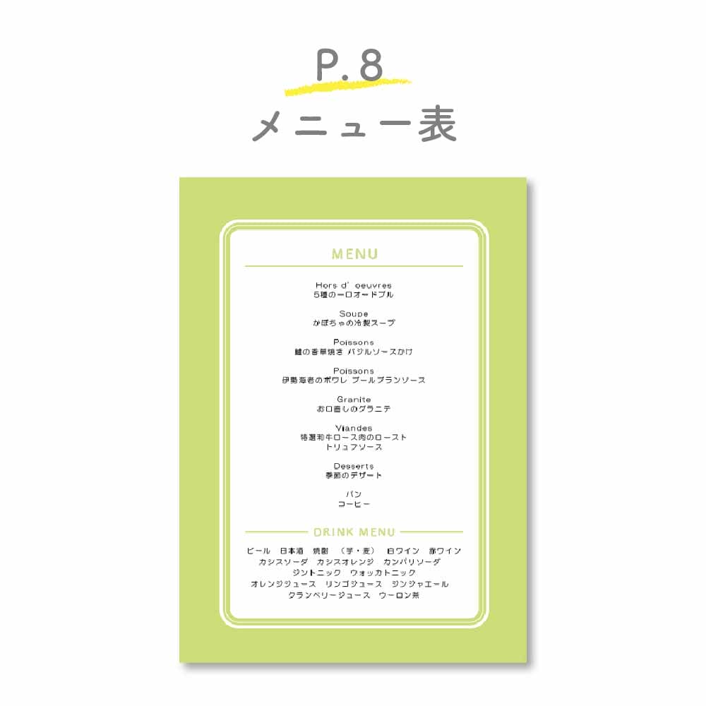 中綴じ冊子タイプはホッチキス止めとなるため 中央のP.4-5にテストをもってきてています。※席次表面にすることも可能ですが その場合はホッチキスが高砂やゲストテーブルに被る場合もあるので要注意!