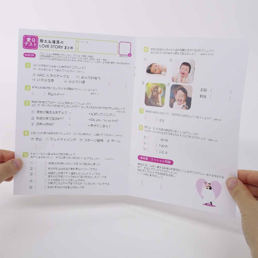 2人の出会いや思い出をクイズ形式にしています。ペンを準備してゲストのみんなに回答してもらいましょ。