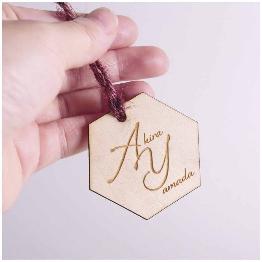 ※木をレーザーでカットしてしあげるため穴を通すときに焦げ目がつきますので、紐は濃いめの色がおススメです。