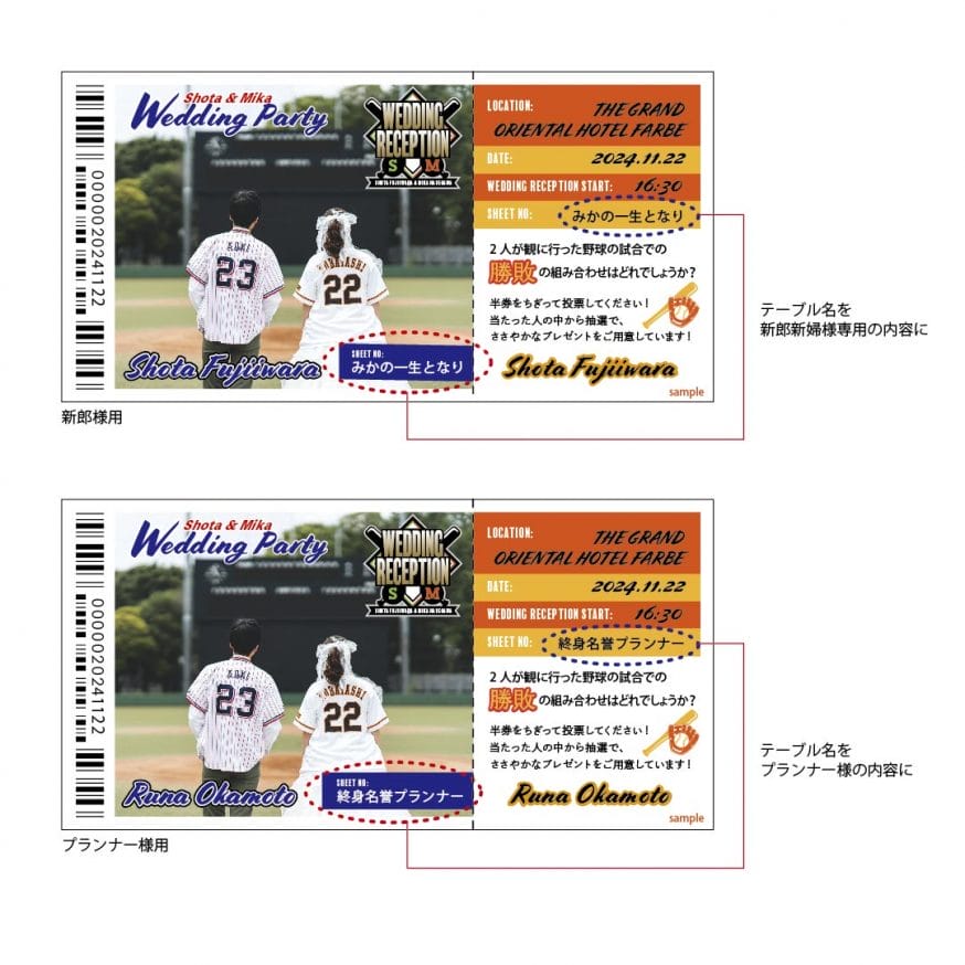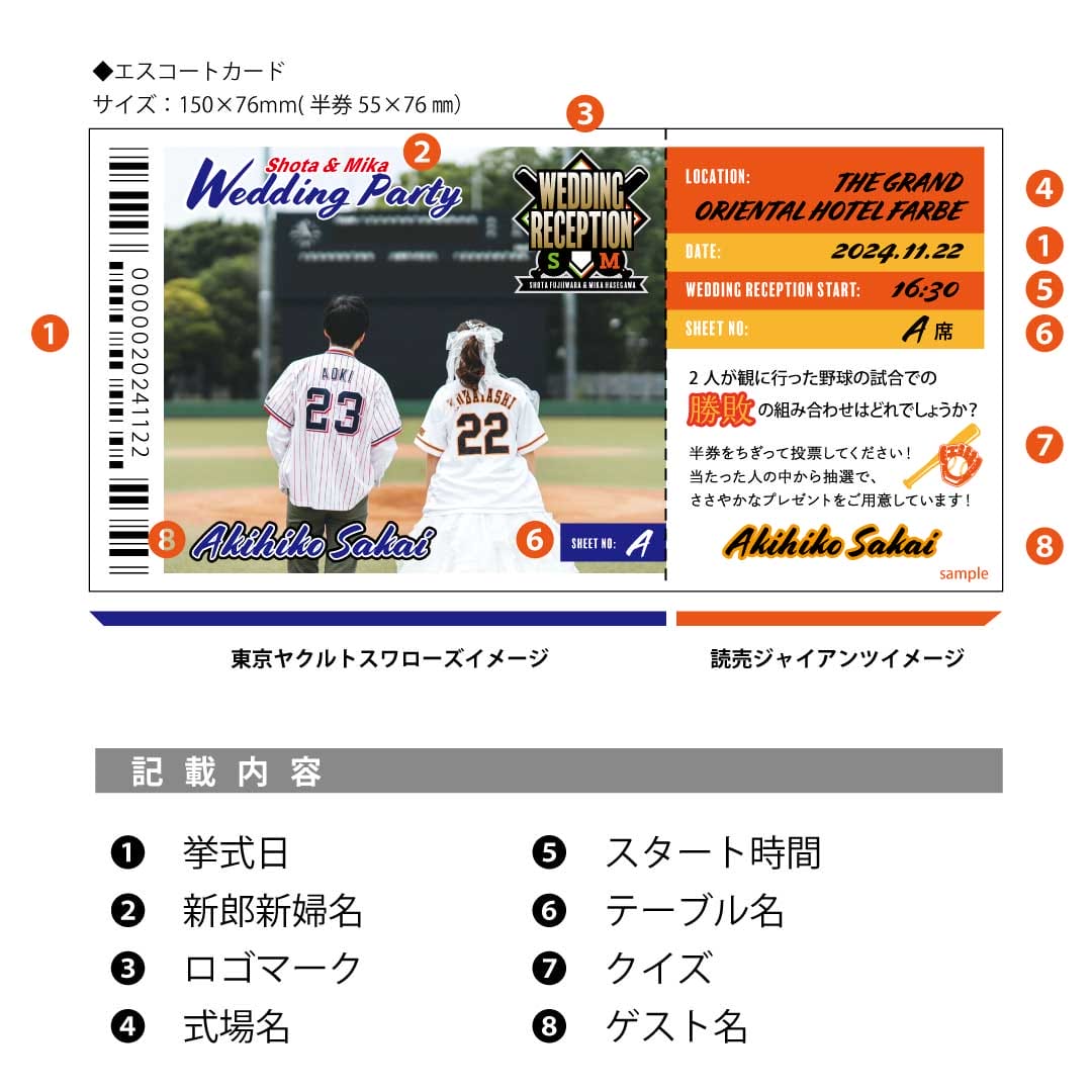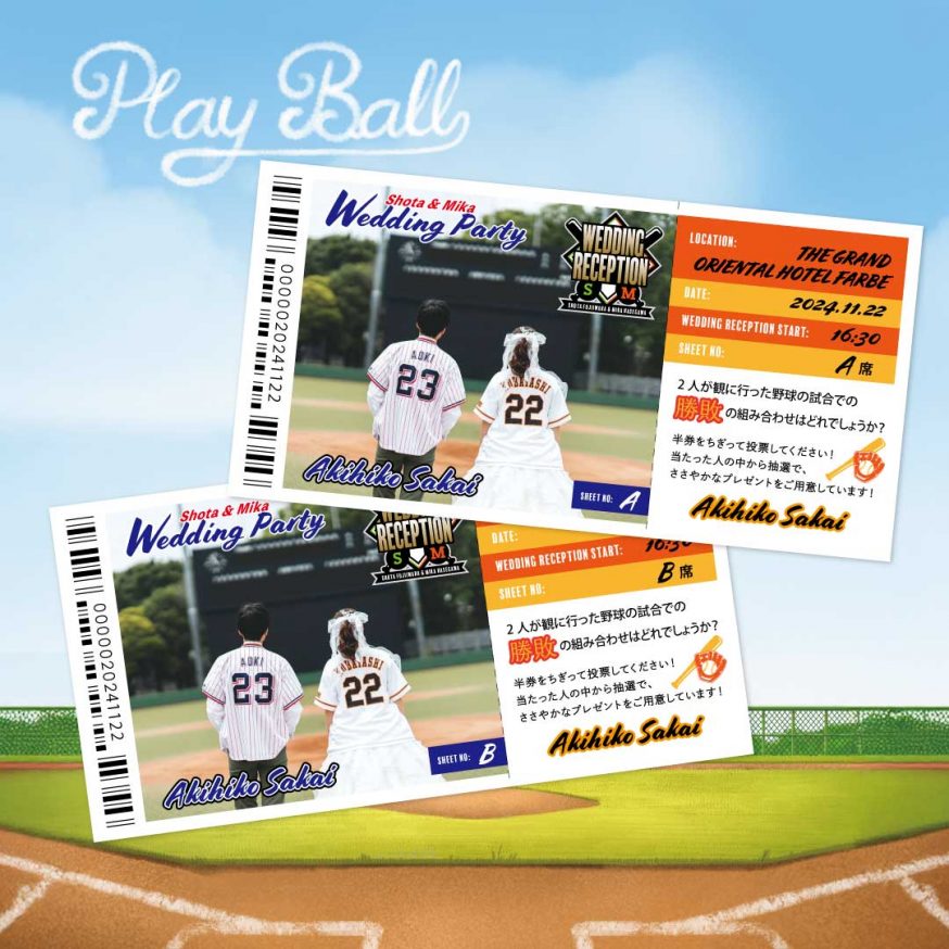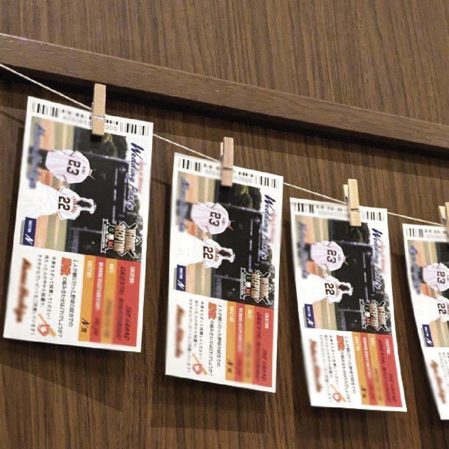 野球好きなお二人。新郎様新婦様の好きな推し球団を一枚のデザインに取り入れたエスコートカードをお作りいたしました。