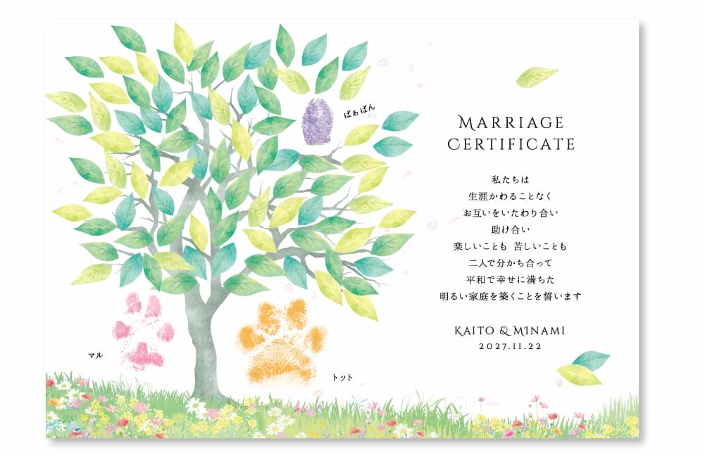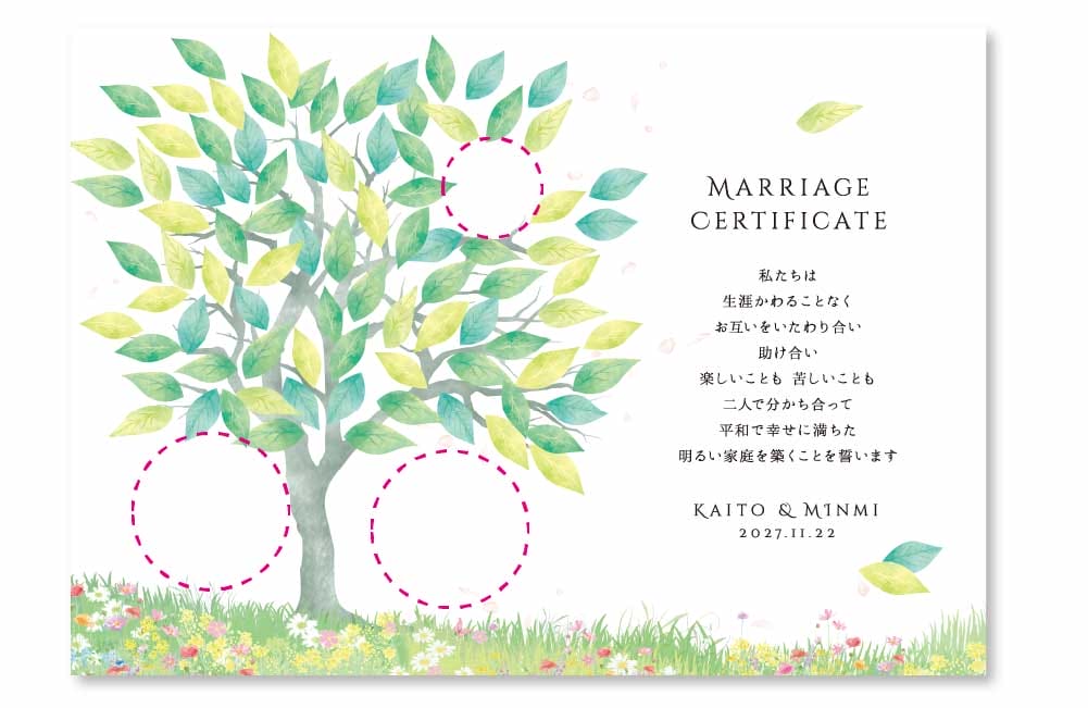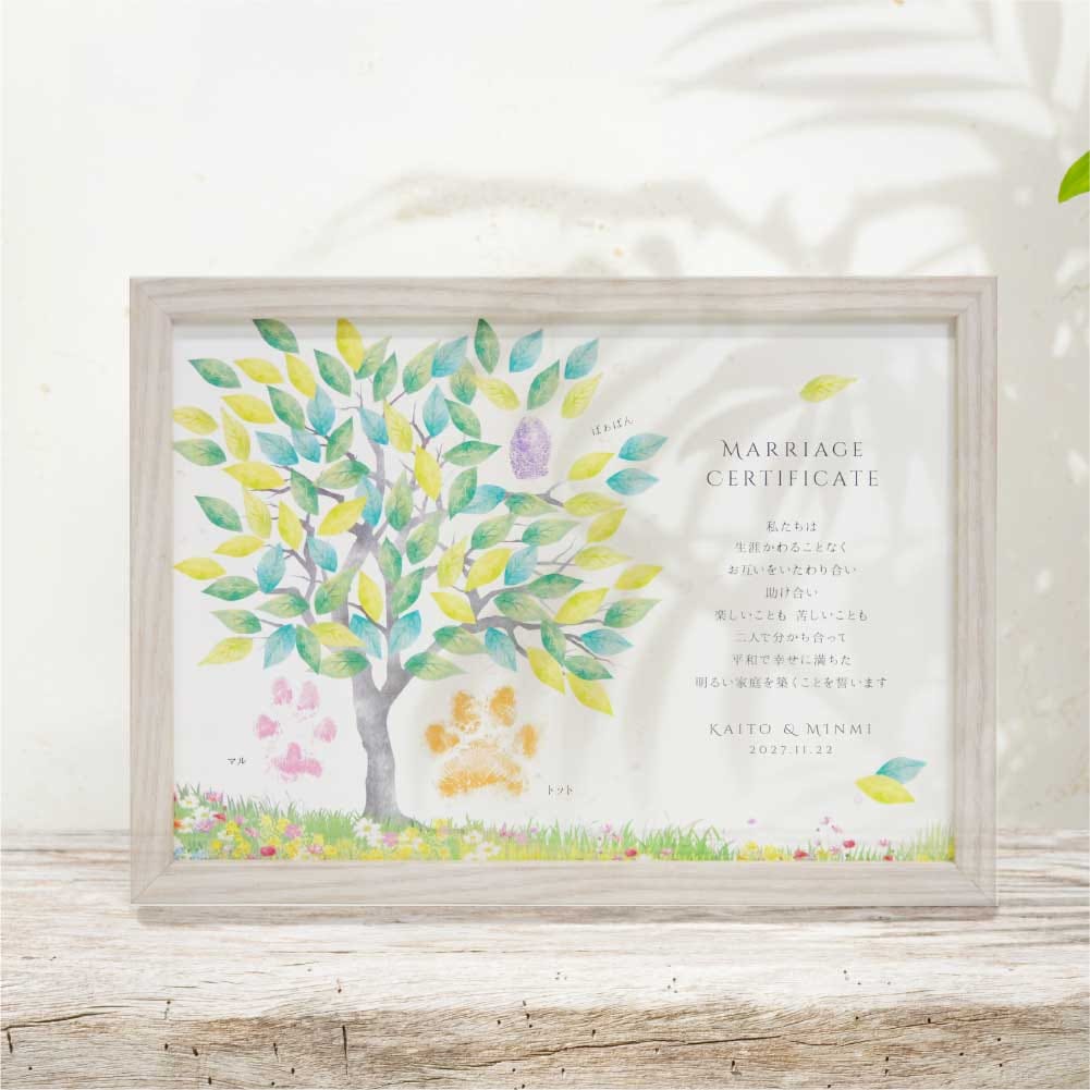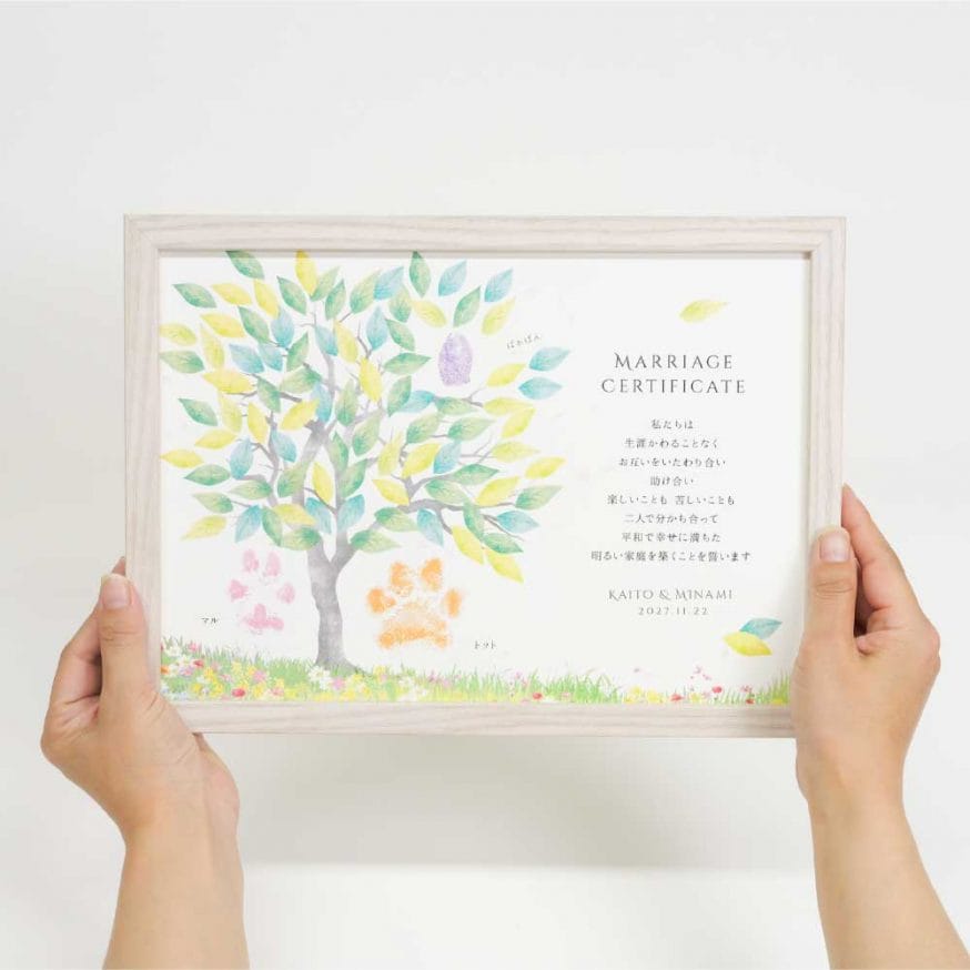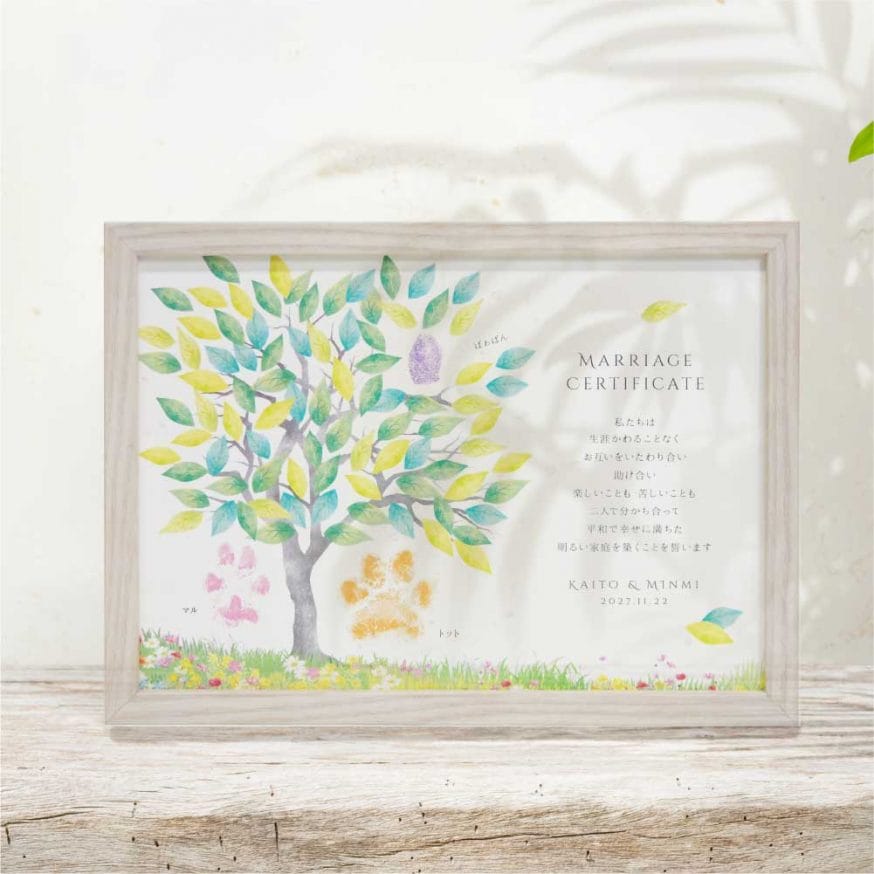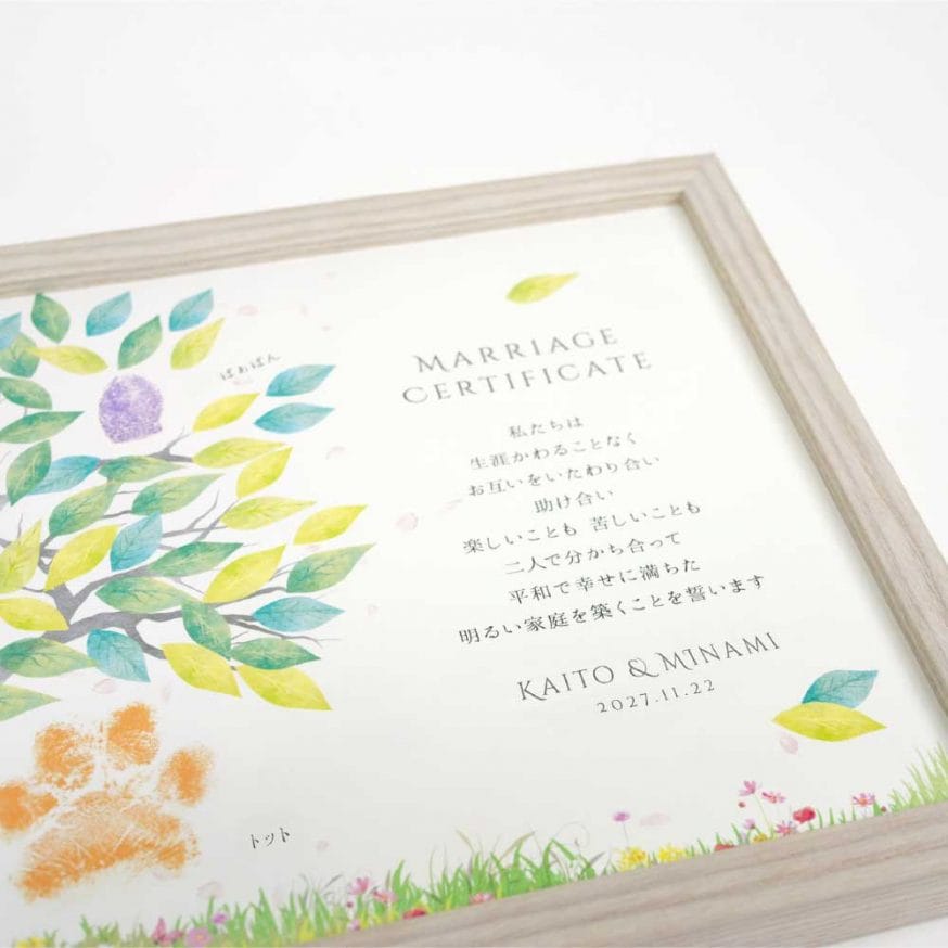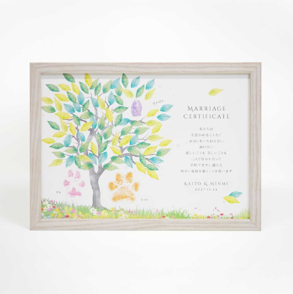 ツリーと草花で優しい雰囲気に仕上げた今回の結婚証明書に仕上がりました♪