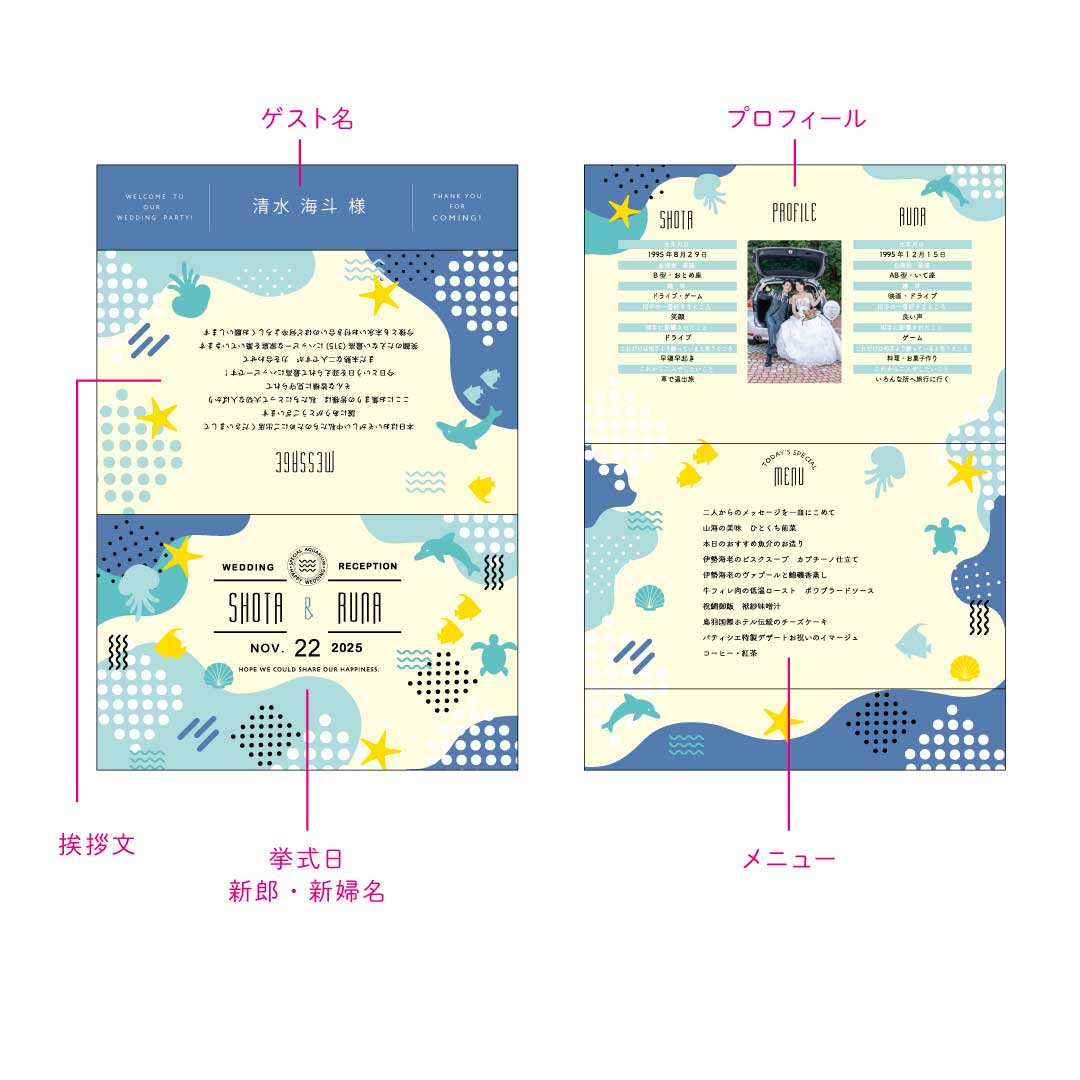 デザインだけではなく、席札&挨拶文&メニュー表&プロフィールが一つにまとまった多機能ペーパーアイテムです。