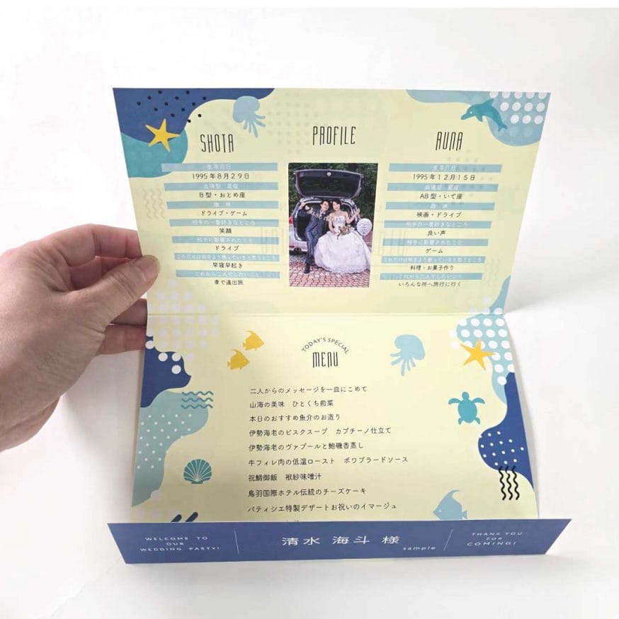 ゲスト名・プロフィール・メニュー・挨拶文が全部入った多機能ペーパーアイテム