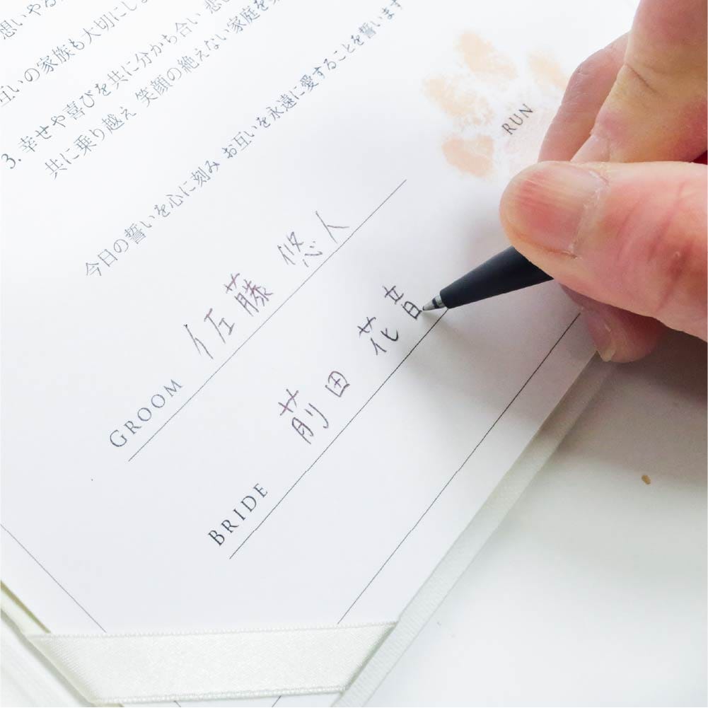 お二人の結婚の誓いを予め印字してお届けするので、挙式中に新郎新婦は手書きでサインしていただくだけ!