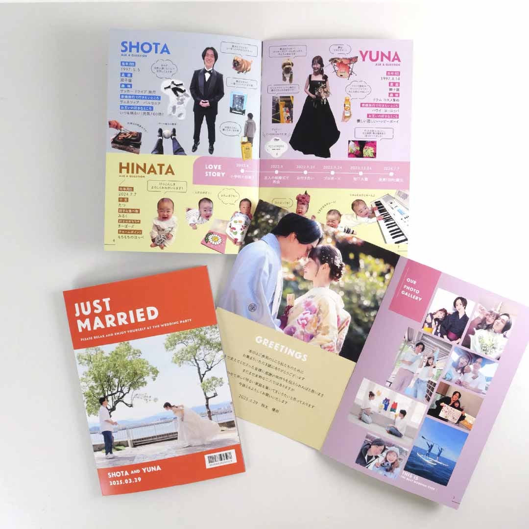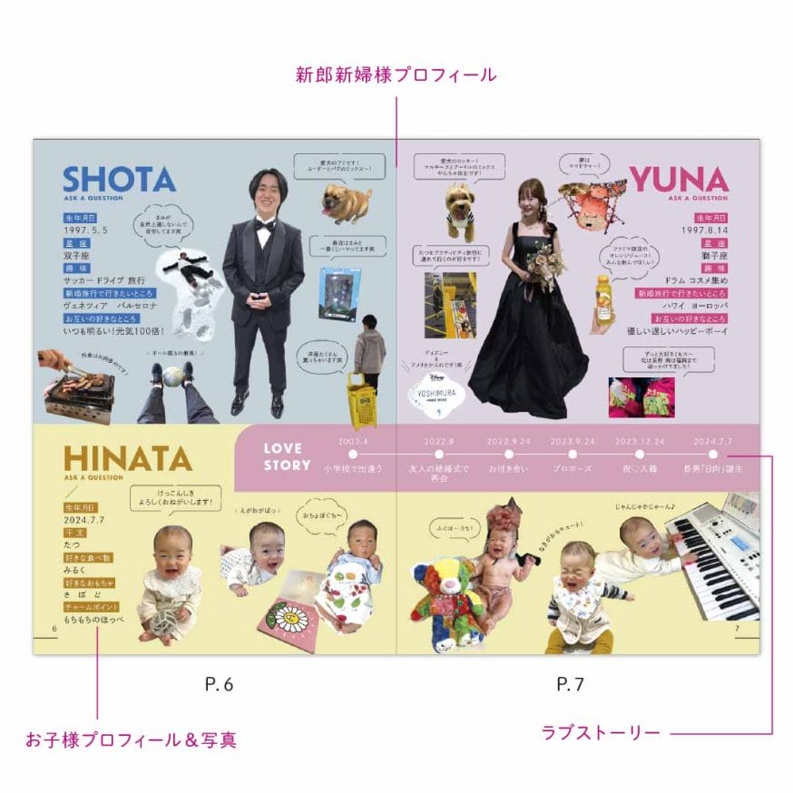 新郎新婦様のプロフィール+ラブストーリー+お子様のプロフィールが入った見開きのプロフィールページ