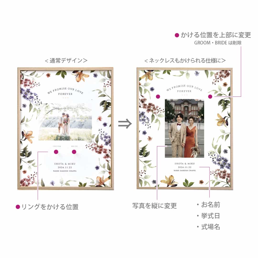 A:はい、可能です!今回のように、ネックレスを掛けたい、写真のレイアウトを変えたい、お花の位置を調整したい…など、お客様のご要望に合わせて自由にカスタマイズできます。