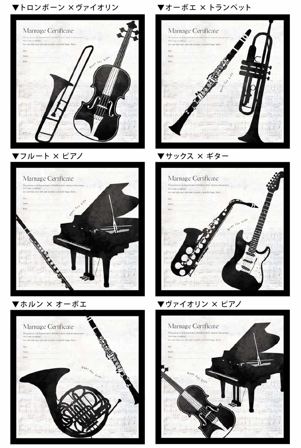 『楽器(music)結婚証明書』のアレンジ版です。もともとの1つの楽器モチーフに加え、複数の楽器で仕上げることが可能です!