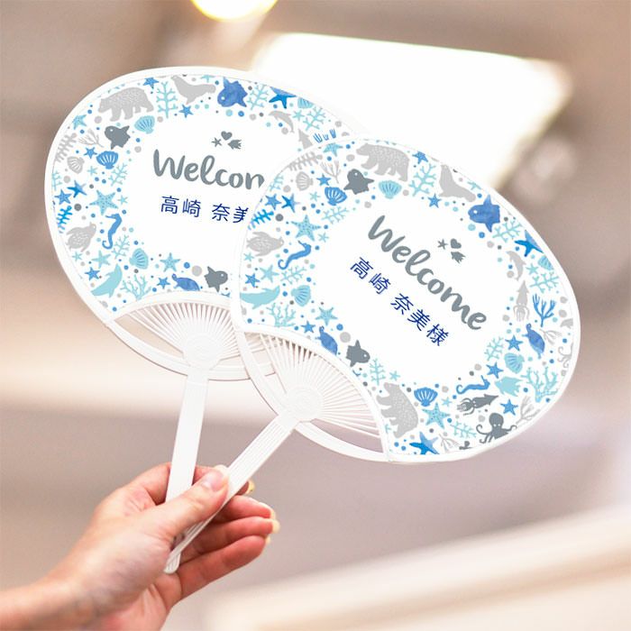夏の結婚式の最強おもてなしアイテム「うちわ」。席札として使ってほしいから、ゲスト一人ひとりのお名前をうちわに印刷しました。水族館はもちろん、海が大好き!というお二人にもぴったり♡シーサイドのロケーションやリゾート婚にもおすすめ!SNSにアップしたくなる夏アイテムです!
