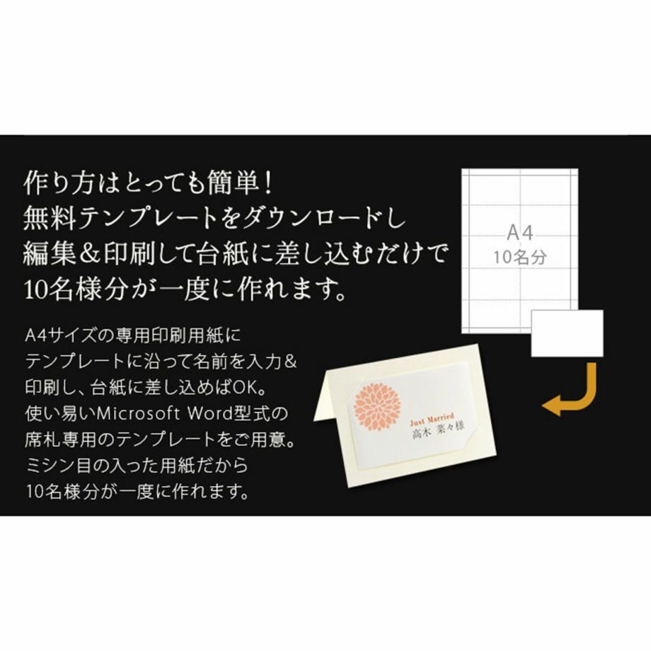 画像拡大 「ジュリア」席札DIY手作りセット(10名分) 手作りキット (0) 商品番号 HM-c-julia 販売価格 ¥ 880 税込 [ 8 ポイント進呈 ] 10名様1セット価格です お気に入り登録 1 2 3 4 5 6 7 8 9 10+ カートに入れる 15,000円以上のお買い物で送料無料未満の場合の送料800円~地域ごとに異なります。こちらをご覧くださいませ 商品についてのお問い合わせ 結婚式席札「ジュリア席札手作りセット」 和モダンデザインの結婚式の席札 手作りの席札で心に残る結婚式を… ジュリア席札手作りセットのテンプレートはこちらよりご覧いただけます A4サイズミシン目入り席札テンプレート 心に残る結婚式を演出するために、席札を手作りしたい方にオススメです。 お届けの内容 (1)台紙(10枚) (2)A4ミシン目プリント用紙(1枚) ※1セットで10名様分作れます ※商品画像イメージはテンプレートを印刷したものでお届けするのは無地のペーパーです サイズ 台紙:148×100mm プリント用紙:297×210mm ご購入特典 商品お届け時に、ファルベのテンプレートサイトのダウンロードパスワードをお知らせいたします。ご購入特典としてサイト内の全てのテンプレートをご利用いただけます。 ※ テンプレートはMicrosoft Wordで編集可能です。 納期 通常3営業日以内に発送予定(土日祝除く) ※ただし、お支払いが銀行振込の場合はご入金確認後の発送となります 失敗しても安心! 予備用にもおすすめ 席札の中面に手書きのメッセージを 一緒に揃えておくと便利なアイテム プリント用紙追加オプション(1枚) ゲルインクボールペン 手作りセット各種オプション レビューを書く