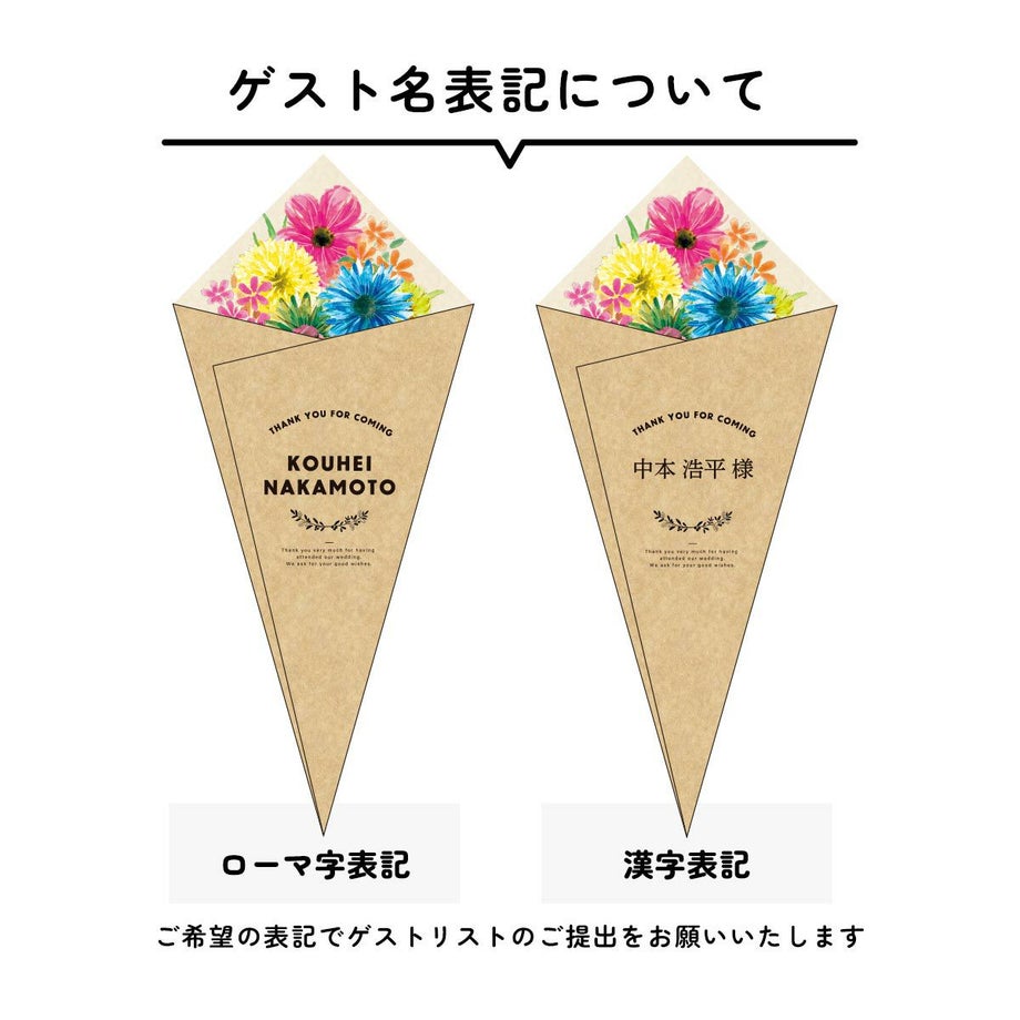 画像拡大 入力印刷付き テーブルが華やぎ、メッセージカードにもなる! 席札メニュー表花束「ブーケ」(1名様分) 4.60 (5) 商品番号 od-cm-bouquet 販売価格 ¥ 550 税込 (1枚あたりの価格です) [ 5 ポイント進呈 ] 出荷の目安 ご注文後すぐ素材を提出いただいた場合 通常 出荷予定 特急対応(有料)> 出荷予定 +地域別の到着目安はこちら +商品制作にデータのご提出が必要な商品ですご注文からお届けまでの流れ +特急対応(有料)のご注文はこちら 送料 商品合計 ¥15,000円以上送料無料(北海道、沖縄、一部地域除く) +地域別の送料はこちら ご注文は数量10部より承ります。 10部未満のご注文は対応不可。 +キッズメニュー、アレルギー対応メニューについての注意点 項目を指定してカートに入れる 商品についてのお問い合わせ 新郎様のお名前(例 奏太)(必須) ※ : / ~ などの半角記号は使用不可 新婦様のお名前(例 美咲)(必須) ※ : / ~ などの半角記号は使用不可 挙式日(例 20XX.11.22)(必須) ※ : / ~ などの半角記号は使用不可 花束組立て作業(必須) 選択してください 自分で組立てる(+¥0 税込) お店に依頼する(+¥110 税込) お気に入り登録 1 2 3 4 5 6 7 8 9 10+ カートに入れる 閉じる × これと似た商品を見る 席札メニュー表花束「ブーケ」1名様分 まるでミニブーケのようにお花がプリントされた席札メニュー表。カラフルなお花が可愛くゲストをお出迎えしてくれます。テーブルがいっきに華やぐおしゃれなアイテムです。 ゲストの目を惹く装飾のキーアイテム テーブルを華やかに彩ってくれる花束みたいな席札メニュー表。目にした瞬間、ゲストから歓声があがりそう!写真撮影タイムにも活躍してくれそうなワクワクするアイテムです。 ゲストの満足度アップ!席札メニュー表展開図 パタパタと折り込んであって、開く楽しみもある席札メニュー表。表紙にはゲストのお名前がおしゃれなフォントでレイアウトされています。テーブルについてこんなに素敵な席札メニュー表が置いてあったら、きっとゲストも喜んでくれるはず。パーティーへの期待がいっそう高まるおもてなしに。 まず右側を開けばお二人からの感謝のメッセージがあらわれます。 メッセージ(固定文) 皆様の祝福につつまれて今日の日を迎えられたことに心から感謝いたします本日は楽しいひとときをお過ごしいただければ幸いです すべて開くとおしゃれな花束があらわれます。左面にはお食事のメニュー、右面にはドリンクのメニューが入ります。 ※ドリンクメニュー不要の場合は、お料理メニューのみ印字して作成も可能です。 裏面にゲストへのメッセージを書くのもおススメ!より心あたたまるアイテムとなります。 カラフルなブーケデザインがおしゃれ ピンク、ブルー、イエローなどミックスされた可愛いカラフルブーケのデザイン。見るだけで気分もパッと明るくなるおしゃれなアイテムです。 クリップでとめてお使いください 席札メニュー表の開きを固定するクリップ付き。お申し込み部数分、同梱してお届けします。お客様でセットしてお使いください。 ※クリップの形状は変更になる場合がございます 原稿を送るだけ! 文字レイアウト作業はファルべが対応します! レイアウトの微調整もお任せ ご注文前に必ずご確認ください ご注文時のミスが増えております ご注文の際に「数量」のご確認原稿提出の際に「誤字・脱字」のご確認をよろしくお願いいたします。 原稿提出後の修正はお受けできませんので、お手数ではございますが、再度ご注文ください。10部未満のご注文は対応不可となりますので、修正が必要な部数が10部未満の場合も、10部分の金額がかかります。 印刷前に仕上がりを確認したい方は 仕上がりイメージ確認オプション(有料) をご利用ください ご注文からお届けまで まずはショッピングカートよりご注文を完了してください。その後、専用フォームより原稿のご提出をお願いいたします。 ゲストのお名前はローマ字または漢字となります。ご希望の表記でゲストリストのご提出をお願いいたします。 Mr、Msなどそれぞれ敬称が必要な場合も必ず合わせてご指示くださいませ。 こちらの商品には校正がございません。お客様から頂いた原稿のままで印刷させて頂きます。(事前に仕上がりを確認されたい場合は、校正オプションをあわせてお申込みください) 原稿アップロードフォームはこちら お届けの内容 ・席札メニュー表・クリップ ※クリップはお客様にてセットしてご使用ください サイズ 200×200mm(開いた状態) 納期 原稿到着から10営業日(土日祝のぞく) ご注文に際して ご注文は10部より承ります お支払方法 名入れ商品につき「代金引換」はお選びいただけません ご注文後の流れ ご注文完了後、お早めに専用フォームより原稿をご送付ください。 ご注文→原稿送付→印刷→商品発送 ゲストリスト原稿送付フォーム ゲストのお名前はローマ字または漢字となります。ご希望の表記でゲストリストのご提出をお願いいたします。 それぞれ敬称が必要