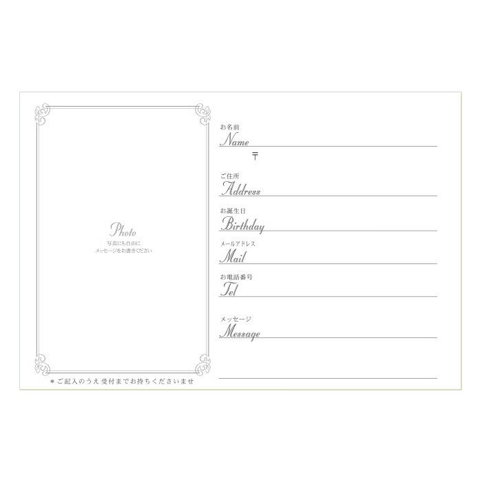 画像拡大 芳名ボックス「ベルジュール」(カードorチェキカード80枚入) 5.00 (1) 商品番号 GB-C-VZ 定価 ¥ 3,630 のところ 販売価格 ¥ 3,300 税込 [ 30 ポイント進呈 ] カード種類(必須) 選択してください カードタイプ チェキカードタイプ BOXカラー 選択してください ○ ホワイト ○ ブラウン お気に入り登録 1 2 3 4 5 6 7 8 9 10+ カートに入れる 15,000円以上のお買い物で送料無料未満の場合の送料800円~地域ごとに異なります。こちらをご覧くださいませ 商品についてのお問い合わせ ボックス型カード式芳名帳「ベルジュール」芳名カード80枚入/結婚式受付 一生とっておきたいものだから。 2タイプからえらべる芳名カードたっぷり80枚とドロワータイプの収納ボックスのこだわりのセットです。 受付でも視線を集める!おしゃれな収納ボックスは2色から 高級感たっぷりの表情のある質感に「GUEST BOOK」の文字入り。受付に置けばゲストの視線を集めそうなおしゃれなボックスです。引き出しタイプで使いやすく、式後の保管にも便利!ホワイト、ブラウンの2色からお選びいただけます。 清楚なホワイトにはやさしいブルーをアクセントに。光沢のあるライトブルーのリボンとボックスの質感の組み合わせが可憐な雰囲気をただよわせます。引き出しやすいようリボンの素材の持ち手が付いています。 お洒落なブラウンには色味の異なるリボンを結んでスタイリッシュ感をプラス。ボックスの質感の組み合わせが洗練された大人の雰囲気。こちらも引き出しやすいようリボンの素材の持ち手が付いています。 中身は選べる2タイプ!カードorチェキカード 中身のタイプは、カードタイプ・チェキカードタイプから使い方に合わせてお選びいただけます。 カードタイプ・・・受付がスムーズに! 招待状と一緒に送ることも可能!当日の受付もスムーズに。 情報量が多く式後の保管・管理に便利。 【記入項目】お名前、ご住所、お電話番号、お誕生日、メールアドレス、メッセージ 招待状に同封してお渡しすれば自宅でゆっくりと書いてから当日お持ちいただくだけでOK。当日記入の場合も一冊の芳名帳に記入待ちの列が出来てお待たせすることもありません。受付に予備を用意しておくと安心! 芳名カードは標準で80枚付属。ボックスには最大120枚まで収納可能です。【→芳名カード追加用リフィルはこちら】 チェキカードタイプ・・・ゲストの写真を残せる! ゲストからのコメントやスナップを一緒に保管できます。 二次会用としてもおすすめ♡ 【記入項目】お名前、ご住所、お誕生日、メールアドレス、お電話番号、メッセージ 二次会にもおすすめのチェキタイプ。ゲストからのコメントやスナップを一緒に保管できます。チェキを差し込むだけの便利な切り込み入り。 芳名カードは標準で80枚付属。カードを追加するとチェキの厚みがあるため収納できない恐れがあります。 80枚以上をご希望の場合は、もうひとつご用意されることをおすすめします【→予備用チェキカードリフィルはこちらから】 カートに入れるボタンにジャンプする お届けの内容 収納ボックス+芳名カード80枚付き ※カードタイプなら最大120枚まで追加可能。 ※チェキカードはチェキの厚みがあるため収納できない恐れがあります。80枚以上をご希望の場合は、もうひとつご用意されることをおすすめします。 サイズ ボックスサイズ:約115×170×H40mm カードサイズ:148×100mm 納期 1~2日以内に発送予定(土日祝除く) ※ただし、お支払いが銀行振込の場合はご入金確認後の手配となります ※メール便による発送はできない商品です 関連商品のご案内 120枚まで追加可能! 追加カード 予備用におすすめ チェキ用カードはこちら 受付をおしゃれに♡ 記帳ペン各種 こちらもいかがですか? もっといろいろ比べたい! 芳名帳ほかのも見る あわせて検討したい♡ 結婚証明書 5.00 1 not2 1 購入者 非公開 投稿日 2022/03/25 式場で注文するよりも、 お手頃価格! 枚数多くて安心。 デザインもとても可愛いくて こちらで購入して良かったと思います! すべてのレビューを見る レビューを書く