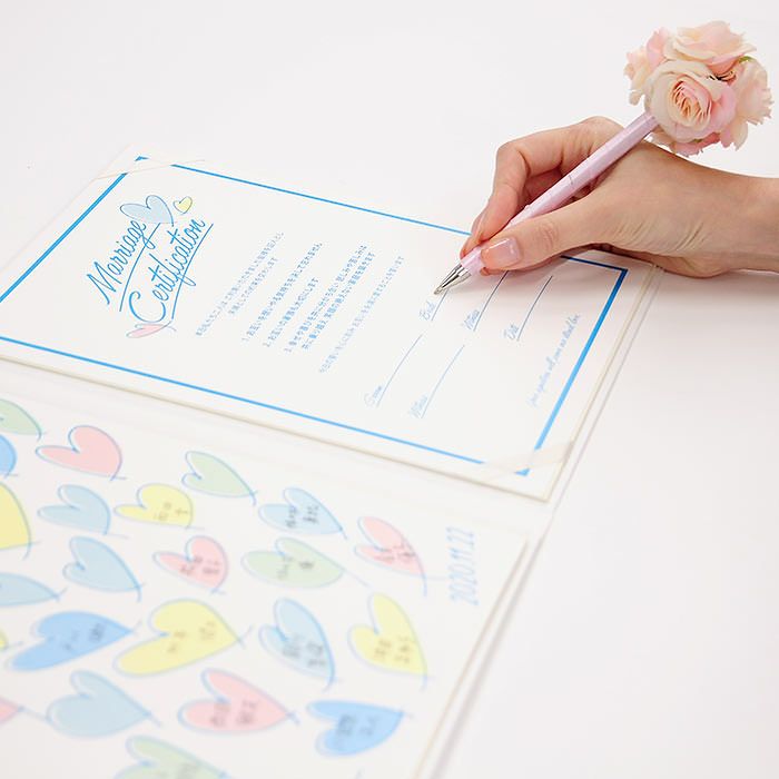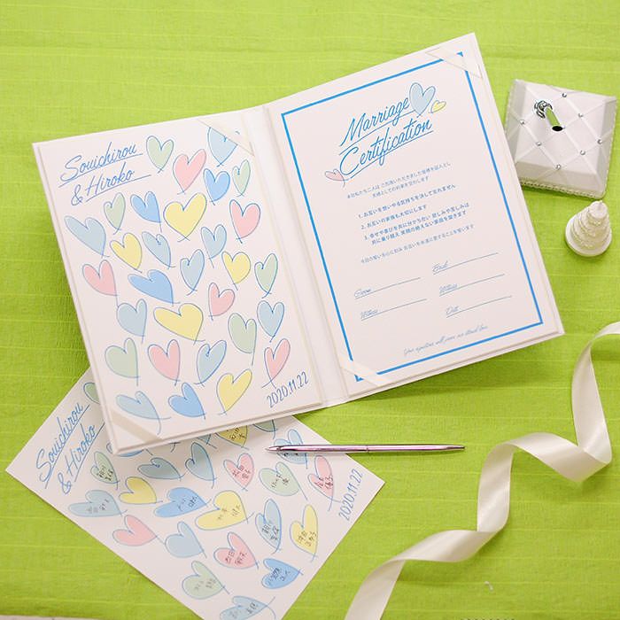 画像拡大 結婚証明書ゲスト参加型「ラッシュハート ブルー」 (0) 商品番号 MC-rushheartblue 販売価格 ¥ 9,130 税込 [ 83 ポイント進呈 ] 出荷の目安 通常 出荷予定 特急対応(有料) 出荷予定 +地域別の到着目安はこちら +商品制作にデータのご提出が必要な商品ですご注文からお届けまでの流れ 送料 商品合計 ¥15,000円以上送料無料(北海道、沖縄、一部地域除く) +地域別の送料はこちら 項目を指定してカートに入れる 商品についてのお問い合わせ 文章(宣言)(必須) 選択してください A B C D(通信欄に入力ください) 特急オプション(必須) 選択してください 希望しない→納期5営業日 希望する→納期3営業日(+¥2,200 税込) 新郎様のお名前(例 Tetsuya)(必須) ※ : / ~ などの半角記号は使用不可 新婦様のお名前(例 Kyoko)(必須) ※ : / ~ などの半角記号は使用不可 挙式日(例 20XX.11.22)(必須) ※ : / ~ などの半角記号は使用不可 お気に入り登録 1 2 3 4 5 6 7 8 9 10+ カートに入れる 閉じる × これと似た商品を見る 結婚証明書ゲスト参加型 ラッシュハート ブルー ゲストにも参加いただく結婚の承認サイン。 人前式のお二人にピッタリの演出アイテムです。 結婚の宣言もお二人の言葉で入れれば 他にない、お二人だけのオリジナル結婚証明書になります。 右面:メッセージの文章タイプ(定型文またはオリジナル文) A We promise to be husband and wife before these witnesses here present. We swear to admire, love and help each other and to create a peaceful happy family. B 私たちは 今日ここにお集まりくださった 皆様の前で 生涯かわることなく お互いをいたわり合い 助け合い 楽しいことも 苦しいことも 二人で分かち合って 平和で幸せに満ちた 明るい家庭を築くことを誓います C 本日私たち二人は ご列席いただきました皆様を証人とし 夫婦としての約束を交わします 1.お互いを想いやる気持ちを決して忘れません 2.お互いの家族も大切にします 3.幸せや喜びを共に分かち合い 悲しみや苦しみは共に乗り越え 笑顔の絶えない家庭を築きます 今日の誓いを心に刻み お互いを永遠に愛することを誓います Dオリジナル オリジナル文章(200文字以内)※注文書の通信欄またはメールにご記入下さい ※オリジナル文章の句読点はデザインによりスペース等にさせていただく場合もございます ◆式に間に合わない! そんな方はこちら 結婚式に間に合わない…そんな方もご安心ください。ご注文時に特急オプション「希望する」をお選びの上、ご注文いただくとスピード対応いたします。※別途特急オプション料金が加算されます。 お届けの内容 結婚証明書…ホワイト1冊 証明シート(本人記帳用)…1枚 証明シート(ゲスト記帳用)…2枚 サイズ カバーサイズ197mm×266mm シートサイズ182mm×257mm 納期 5営業日(土日祝のぞく) 特急オプション「希望する」の場合は3営業日(土日祝のぞく) ※ただし、お支払いが銀行振込の場合はご入金確認後の手配となります お支払い方法 名入れ商品につき「代金引換」はお選びいただけません 関連商品の ご案内 写真追加プションお好きな写真を1点追加できます ゲスト参加型婚証明書専用ゲスト署名欄追加オプション レビューを書く