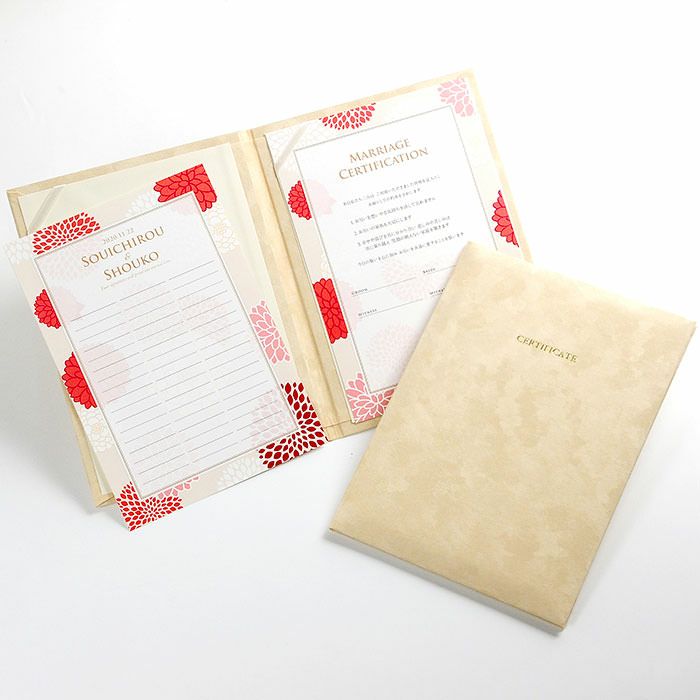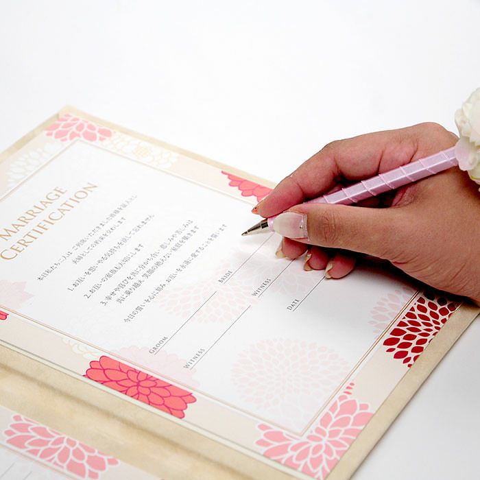 画像拡大 結婚証明書ゲスト参加型「ジュリア薄橙」 (0) 商品番号 MC-juliausu 販売価格 ¥ 9,130 税込 [ 83 ポイント進呈 ] 出荷の目安 通常 出荷予定 特急対応(有料) 出荷予定 +地域別の到着目安はこちら +商品制作にデータのご提出が必要な商品ですご注文からお届けまでの流れ 送料 商品合計 ¥15,000円以上送料無料(北海道、沖縄、一部地域除く) +地域別の送料はこちら 項目を指定してカートに入れる 商品についてのお問い合わせ 文章(宣言)(必須) 選択してください A B C D(通信欄に入力ください) 特急オプション(必須) 選択してください 希望しない→納期5営業日 希望する→納期3営業日(+¥2,200 税込) 新郎様のお名前(例 Tetsuya)(必須) ※ : / ~ などの半角記号は使用不可 新婦様のお名前(例 Kyoko)(必須) ※ : / ~ などの半角記号は使用不可 挙式日(例 20XX.11.22)(必須) ※ : / ~ などの半角記号は使用不可 お気に入り登録 1 2 3 4 5 6 7 8 9 10+ カートに入れる 閉じる × これと似た商品を見る 結婚証明書ゲスト参加型 ジュリア薄橙 ゲストにも参加いただく結婚の承認サイン。 人前式のお二人にピッタリの演出アイテムです。 結婚の宣言もお二人の言葉で入れれば 他にない、お二人だけのオリジナル結婚証明書になります。 右面:メッセージの文章タイプ(定型文またはオリジナル文) A We promise to be husband and wife before these witnesses here present. We swear to admire, love and help each other and to create a peaceful happy family. B 私たちは 今日ここにお集まりくださった 皆様の前で 生涯かわることなく お互いをいたわり合い 助け合い 楽しいことも 苦しいことも 二人で分かち合って 平和で幸せに満ちた 明るい家庭を築くことを誓います C 本日私たち二人は ご列席いただきました皆様を証人とし 夫婦としての約束を交わします 1.お互いを想いやる気持ちを決して忘れません 2.お互いの家族も大切にします 3.幸せや喜びを共に分かち合い 悲しみや苦しみは共に乗り越え 笑顔の絶えない家庭を築きます 今日の誓いを心に刻み お互いを永遠に愛することを誓います Dオリジナル オリジナル文章(200文字以内)※注文書の通信欄またはメールにご記入下さい ※オリジナル文章の句読点はデザインによりスペース等にさせていただく場合もございます ◆式に間に合わない! そんな方はこちら 結婚式に間に合わない…そんな方もご安心ください。ご注文時に特急オプション「希望する」をお選びの上、ご注文いただくとスピード対応いたします。※別途特急オプション料金が加算されます。 お届けの内容 結婚証明書…アイボリー1冊 証明シート(本人記帳用)…1枚 証明シート(ゲスト記帳用)…2枚 サイズ 本体サイズ(閉じた状態)・・200×270mm シートサイズ・・・175×250mm ※こちらの商品は化粧箱がついておりません。 納期 5営業日(土日祝のぞく) 特急オプション「希望する」の場合は3営業日(土日祝のぞく) ※ただし、お支払いが銀行振込の場合はご入金確認後の手配となります お支払い方法 名入れ商品につき「代金引換」はお選びいただけません 関連商品の ご案内 写真追加プションお好きな写真を1点追加できます ゲスト参加型婚証明書専用ゲスト署名欄追加オプション レビューを書く