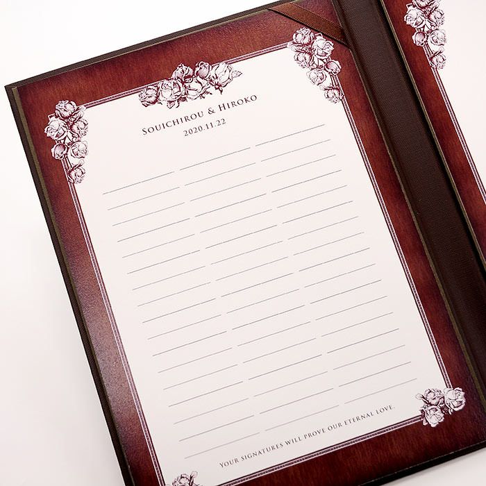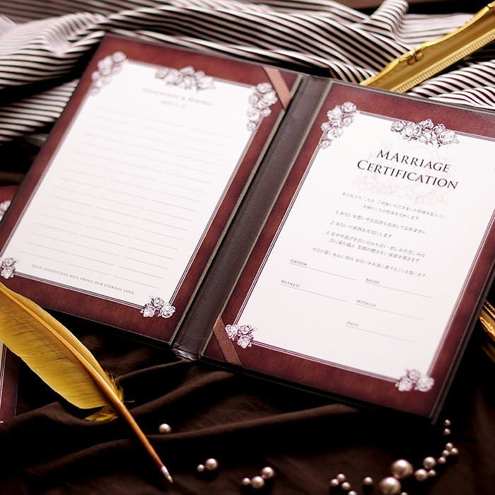 画像拡大 結婚証明書ゲスト参加型「アンティークローズ(51~102名様用)」 (0) 商品番号 MC-antiquerose 販売価格 ¥ 9,130 税込 [ 83 ポイント進呈 ] 出荷の目安 通常 出荷予定 特急対応(有料) 出荷予定 +地域別の到着目安はこちら +商品制作にデータのご提出が必要な商品ですご注文からお届けまでの流れ 送料 商品合計 ¥15,000円以上送料無料(北海道、沖縄、一部地域除く) +地域別の送料はこちら 項目を指定してカートに入れる 商品についてのお問い合わせ 文章(宣言)(必須) 選択してください A B C D(通信欄に入力ください) 特急オプション(必須) 選択してください 希望しない→納期5営業日 希望する→納期3営業日(+¥2,200 税込) 新郎様のお名前(例 Tetsuya)(必須) ※ : / ~ などの半角記号は使用不可 新婦様のお名前(例 Kyoko)(必須) ※ : / ~ などの半角記号は使用不可 挙式日(例 20XX.11.22)(必須) ※ : / ~ などの半角記号は使用不可 お気に入り登録 1 2 3 4 5 6 7 8 9 10+ カートに入れる 閉じる × これと似た商品を見る 結婚証明書ゲスト参加型 アンティークローズ ゲストにも参加いただく結婚の承認サイン。 人前式のお二人にピッタリの演出アイテムです。 結婚の宣言もお二人の言葉で入れれば 他にない、お二人だけのオリジナル結婚証明書になります。 右面:メッセージの文章タイプ(定型文またはオリジナル文) A We promise to be husband and wife before these witnesses here present. We swear to admire, love and help each other and to create a peaceful happy family. B 私たちは 今日ここにお集まりくださった 皆様の前で 生涯かわることなく お互いをいたわり合い 助け合い 楽しいことも 苦しいことも 二人で分かち合って 平和で幸せに満ちた 明るい家庭を築くことを誓います C 本日私たち二人は ご列席いただきました皆様を証人とし 夫婦としての約束を交わします 1.お互いを想いやる気持ちを決して忘れません 2.お互いの家族も大切にします 3.幸せや喜びを共に分かち合い 悲しみや苦しみは共に乗り越え 笑顔の絶えない家庭を築きます 今日の誓いを心に刻み お互いを永遠に愛することを誓います Dオリジナル オリジナル文章(200文字以内)※注文書の通信欄またはメールにご記入下さい ※オリジナル文章の句読点はデザインによりスペース等にさせていただく場合もございます ◆式に間に合わない! そんな方はこちら 結婚式に間に合わない…そんな方もご安心ください。ご注文時に特急オプション「希望する」をお選びの上、ご注文いただくとスピード対応いたします。※別途特急オプション料金が加算されます。 お届けの内容 結婚証明書…ブラウン1冊 証明シート(本人記帳用)…1枚 証明シート(ゲスト記帳用)…2枚 サイズ カバーサイズ197mm×266mm シートサイズ182mm×257mm 納期 5営業日(土日祝のぞく) 特急オプション「希望する」の場合は3営業日(土日祝のぞく) ※ただし、お支払いが銀行振込の場合はご入金確認後の手配となります お支払い方法 名入れ商品につき「代金引換」はお選びいただけません 関連商品の ご案内 写真追加プションお好きな写真を1点追加できます ゲスト参加型婚証明書専用ゲスト署名欄追加オプション レビューを書く