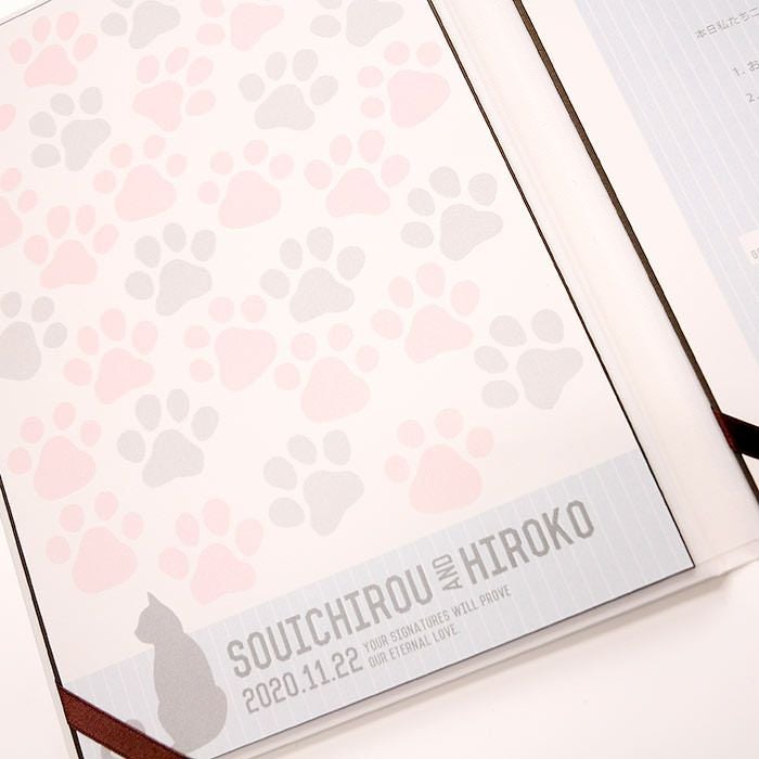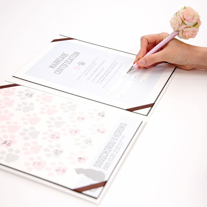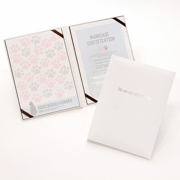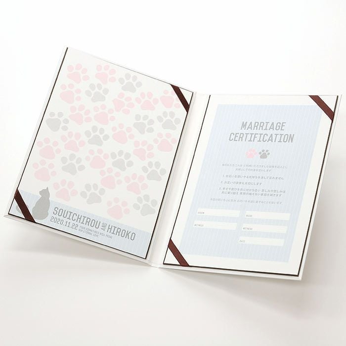 画像拡大 結婚証明書ゲスト参加型「にくきゅう キャット(猫)」 (0) 商品番号 MC-nikukyucats 販売価格 ¥ 9,130 税込 [ 83 ポイント進呈 ] 出荷の目安 通常 出荷予定 特急対応(有料) 出荷予定 +地域別の到着目安はこちら +商品制作にデータのご提出が必要な商品ですご注文からお届けまでの流れ 送料 商品合計 ¥15,000円以上送料無料(北海道、沖縄、一部地域除く) +地域別の送料はこちら 項目を指定してカートに入れる 商品についてのお問い合わせ 文章(宣言)(必須) 選択してください A B C D(通信欄に入力ください) 特急オプション(必須) 選択してください 希望しない→納期5営業日 希望する→納期3営業日(+¥2,200 税込) 新郎様のお名前(例 Tetsuya)(必須) ※ : / ~ などの半角記号は使用不可 新婦様のお名前(例 Kyoko)(必須) ※ : / ~ などの半角記号は使用不可 挙式日(例 20XX.11.22)(必須) ※ : / ~ などの半角記号は使用不可 お気に入り登録 1 2 3 4 5 6 7 8 9 10+ カートに入れる 閉じる × これと似た商品を見る 結婚証明書ゲスト参加型 にくきゅう キャット ゲストにも参加いただく結婚の承認サイン。 人前式のお二人にピッタリの演出アイテムです。 結婚の宣言もお二人の言葉で入れれば 他にない、お二人だけのオリジナル結婚証明書になります。 右面:メッセージの文章タイプ(定型文またはオリジナル文) A We promise to be husband and wife before these witnesses here present. We swear to admire, love and help each other and to create a peaceful happy family. B 私たちは 今日ここにお集まりくださった 皆様の前で 生涯かわることなく お互いをいたわり合い 助け合い 楽しいことも 苦しいことも 二人で分かち合って 平和で幸せに満ちた 明るい家庭を築くことを誓います C 本日私たち二人は ご列席いただきました皆様を証人とし 夫婦としての約束を交わします 1.お互いを想いやる気持ちを決して忘れません 2.お互いの家族も大切にします 3.幸せや喜びを共に分かち合い 悲しみや苦しみは共に乗り越え 笑顔の絶えない家庭を築きます 今日の誓いを心に刻み お互いを永遠に愛することを誓います Dオリジナル オリジナル文章(200文字以内)※注文書の通信欄またはメールにご記入下さい ※オリジナル文章の句読点はデザインによりスペース等にさせていただく場合もございます ◆式に間に合わない! そんな方はこちら 結婚式に間に合わない…そんな方もご安心ください。ご注文時に特急オプション「希望する」をお選びの上、ご注文いただくとスピード対応いたします。※別途特急オプション料金が加算されます。 お届けの内容 結婚証明書…ホワイト1冊 証明シート(本人記帳用)…1枚 証明シート(ゲスト記帳用)…2枚 サイズ カバーサイズ197mm×266mm シートサイズ182mm×257mm 納期 5営業日(土日祝のぞく) 特急オプション「希望する」の場合は3営業日(土日祝のぞく) ※ただし、お支払いが銀行振込の場合はご入金確認後の手配となります お支払い方法 名入れ商品につき「代金引換」はお選びいただけません 関連商品の ご案内 写真追加プションお好きな写真を1点追加できます ゲスト参加型婚証明書専用ゲスト署名欄追加オプション レビューを書く