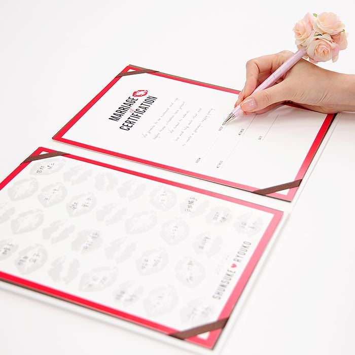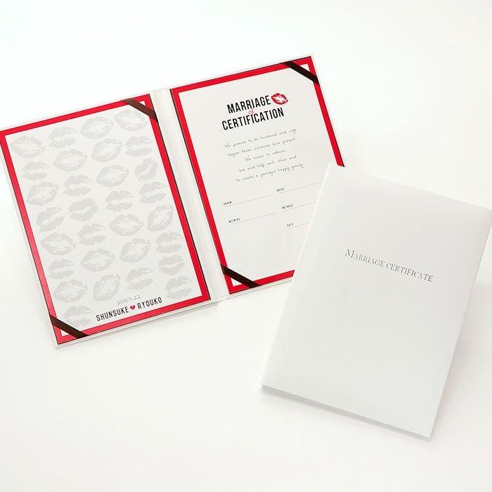 画像拡大 結婚証明書ゲスト参加型「リップ」 (0) 商品番号 MC-lip 販売価格 ¥ 9,130 税込 [ 83 ポイント進呈 ] 出荷の目安 通常 出荷予定 特急対応(有料) 出荷予定 +地域別の到着目安はこちら +商品制作にデータのご提出が必要な商品ですご注文からお届けまでの流れ 送料 商品合計 ¥15,000円以上送料無料(北海道、沖縄、一部地域除く) +地域別の送料はこちら 項目を指定してカートに入れる 商品についてのお問い合わせ 文章(宣言)(必須) 選択してください A B C D(通信欄に入力ください) 特急オプション(必須) 選択してください 希望しない→納期5営業日 希望する→納期3営業日(+¥2,200 税込) 新郎様のお名前(例 Tetsuya)(必須) ※ : / ~ などの半角記号は使用不可 新婦様のお名前(例 Kyoko)(必須) ※ : / ~ などの半角記号は使用不可 挙式日(例 20XX.11.22)(必須) ※ : / ~ などの半角記号は使用不可 お気に入り登録 1 2 3 4 5 6 7 8 9 10+ カートに入れる 閉じる × これと似た商品を見る 結婚証明書ゲスト参加型 リップ ゲストにも参加いただく結婚の承認サイン。 人前式のお二人にピッタリの演出アイテムです。 結婚の宣言もお二人の言葉で入れれば 他にない、お二人だけのオリジナル結婚証明書になります。 右面:メッセージの文章タイプ(定型文またはオリジナル文) A We promise to be husband and wife before these witnesses here present. We swear to admire, love and help each other and to create a peaceful happy family. B 私たちは 今日ここにお集まりくださった 皆様の前で 生涯かわることなく お互いをいたわり合い 助け合い 楽しいことも 苦しいことも 二人で分かち合って 平和で幸せに満ちた 明るい家庭を築くことを誓います C 本日私たち二人は ご列席いただきました皆様を証人とし 夫婦としての約束を交わします 1.お互いを想いやる気持ちを決して忘れません 2.お互いの家族も大切にします 3.幸せや喜びを共に分かち合い 悲しみや苦しみは共に乗り越え 笑顔の絶えない家庭を築きます 今日の誓いを心に刻み お互いを永遠に愛することを誓います Dオリジナル オリジナル文章(200文字以内)※注文書の通信欄またはメールにご記入下さい ※オリジナル文章の句読点はデザインによりスペース等にさせていただく場合もございます ◆式に間に合わない! そんな方はこちら 結婚式に間に合わない…そんな方もご安心ください。ご注文時に特急オプション「希望する」をお選びの上、ご注文いただくとスピード対応いたします。※別途特急オプション料金が加算されます。 お届けの内容 結婚証明書…ホワイト1冊 証明シート(本人記帳用)…1枚 証明シート(ゲスト記帳用)…2枚 サイズ カバーサイズ197mm×266mm シートサイズ182mm×257mm 納期 5営業日(土日祝のぞく) 特急オプション「希望する」の場合は3営業日(土日祝のぞく) ※ただし、お支払いが銀行振込の場合はご入金確認後の手配となります お支払い方法 名入れ商品につき「代金引換」はお選びいただけません 関連商品の ご案内 写真追加プションお好きな写真を1点追加できます ゲスト参加型婚証明書専用ゲスト署名欄追加オプション レビューを書く